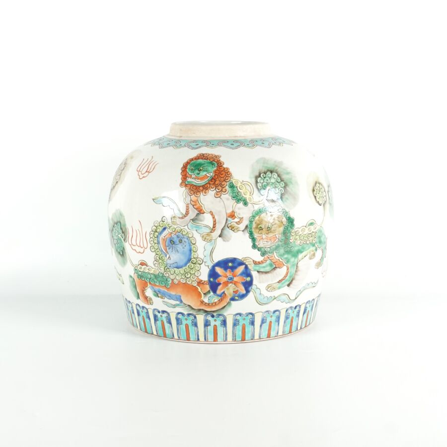 Pot à gingembre en porcelaine et émaux dans le goût de la famille verte à décor de lions, Chine, travail moderne, H. 21 cm (sans couvercle).
