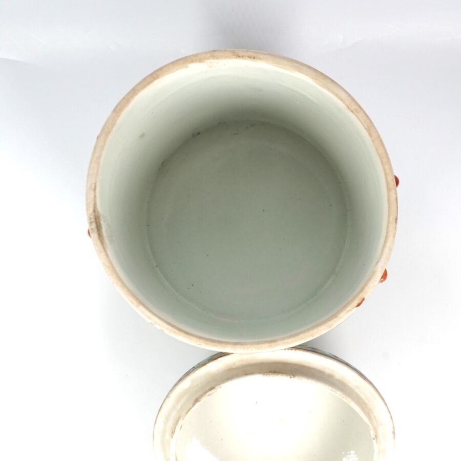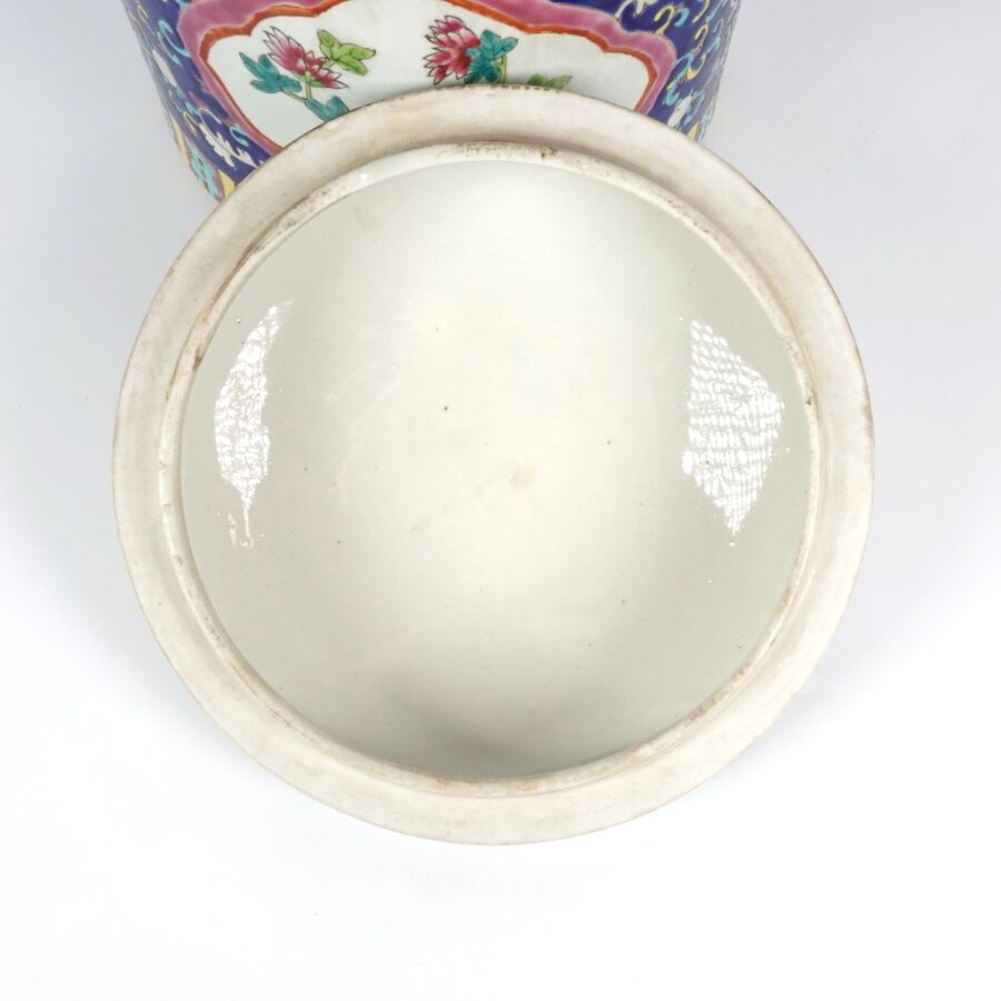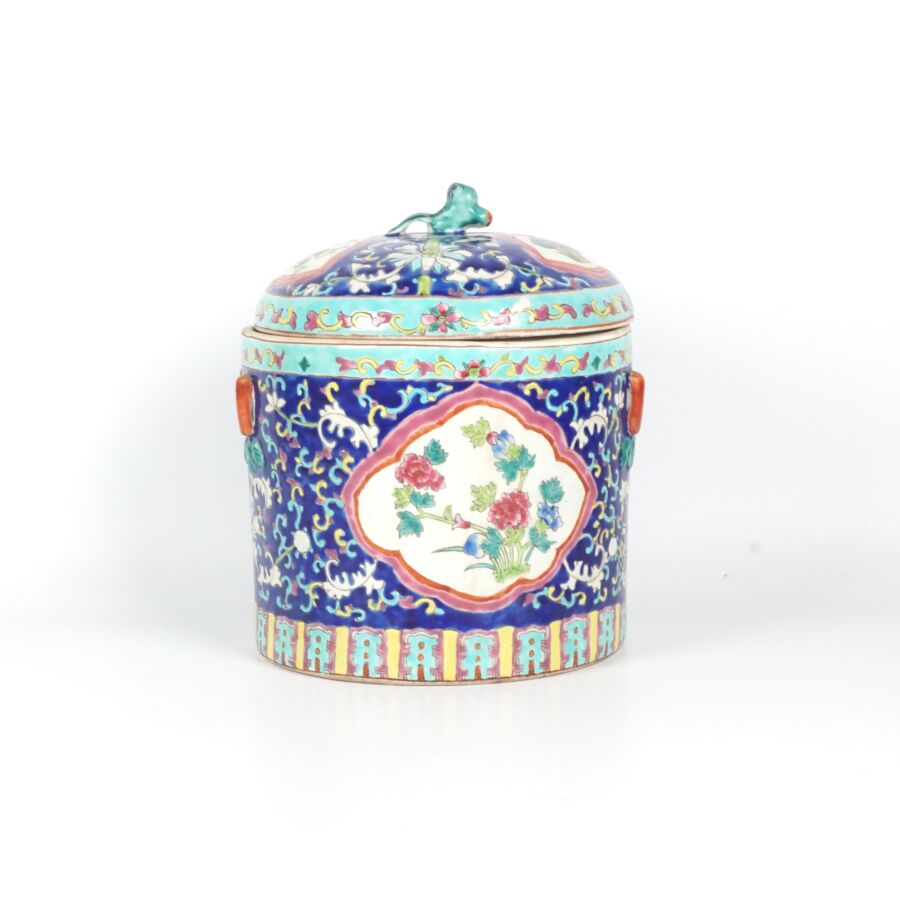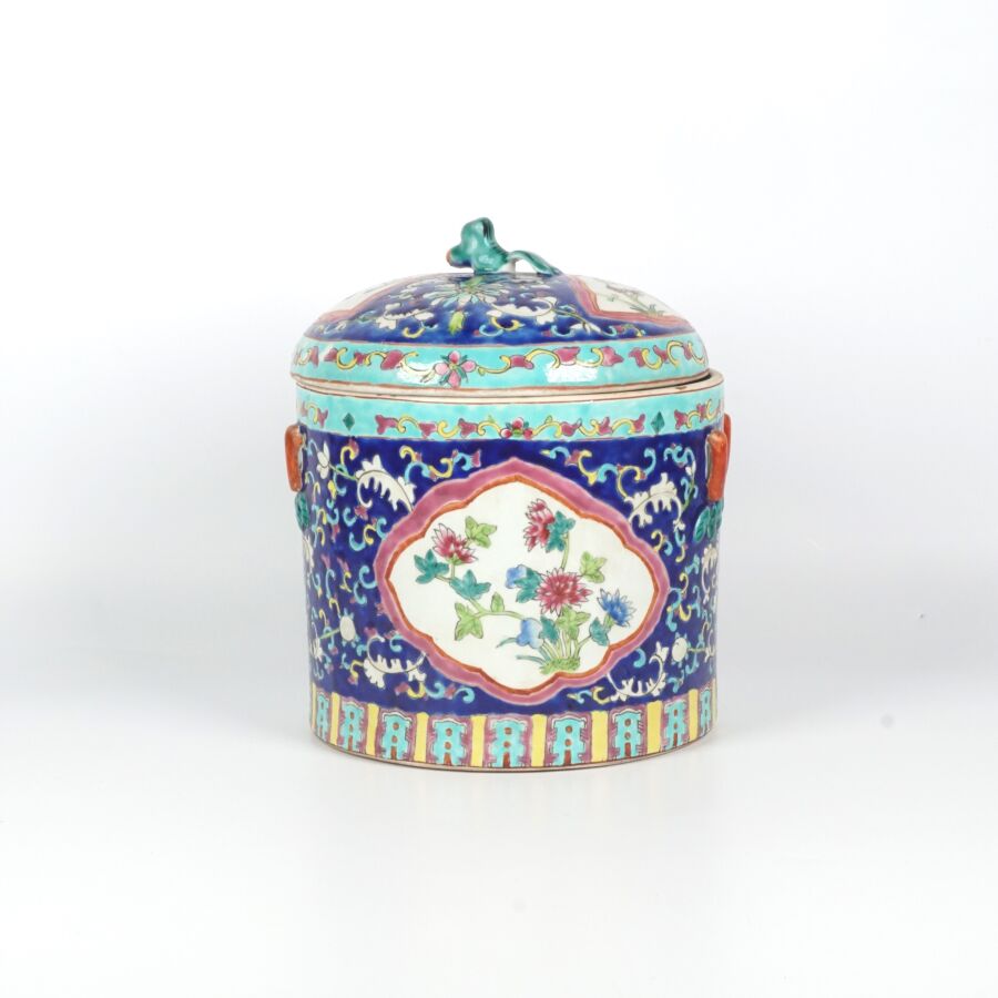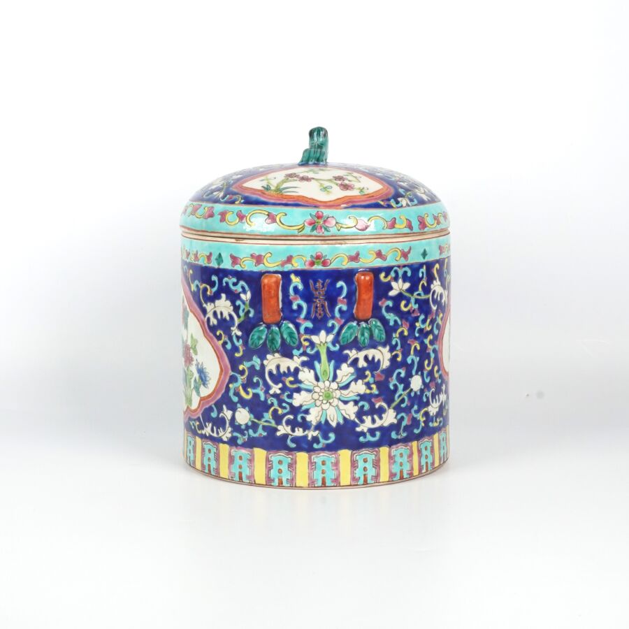 Pot couvert de forme cylindrique en porcelaine et émaux polychromes à décor en réserve de pivoines et de rinceaux, marque au cachet sous la base, Chine, travail moderne, H. 22.5 cm.