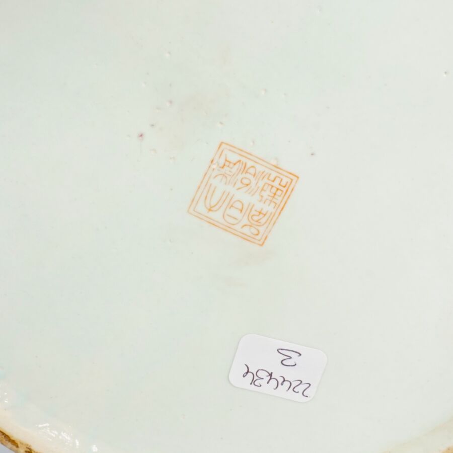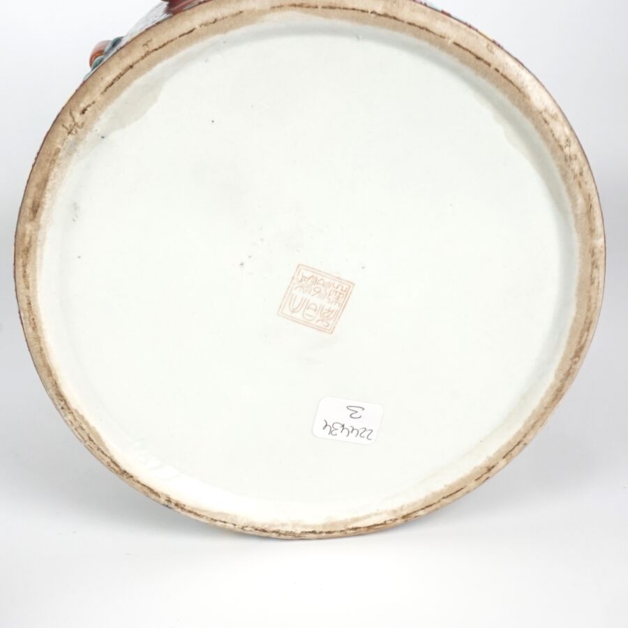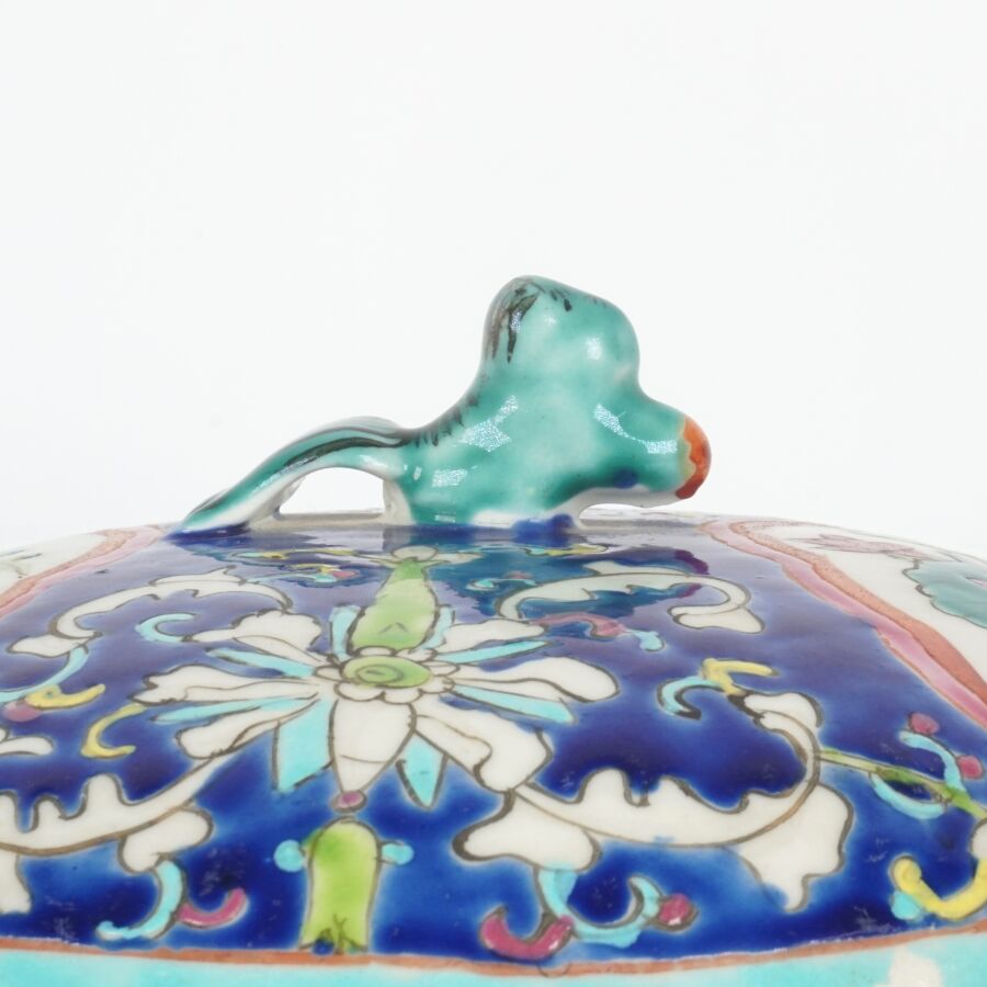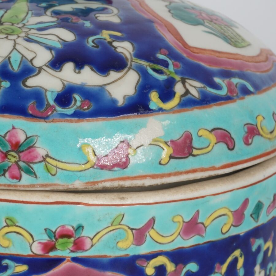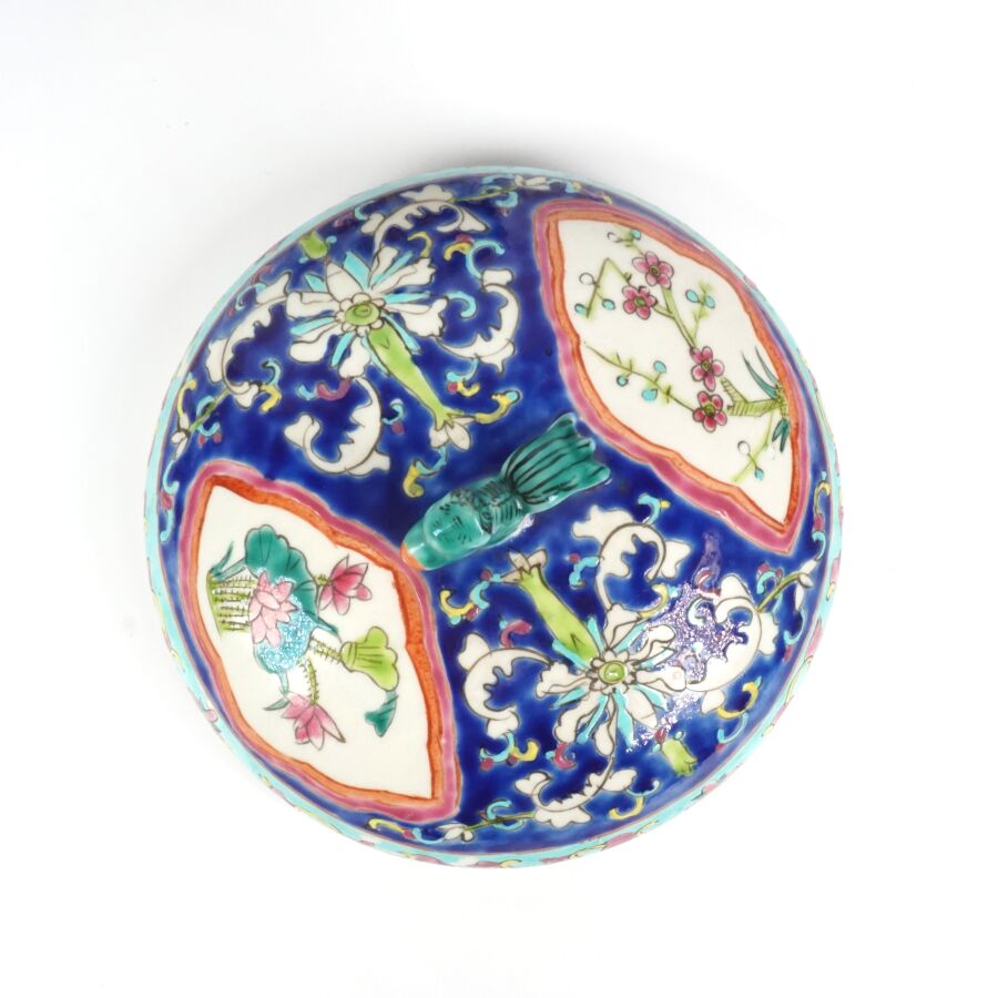 Pot couvert de forme cylindrique en porcelaine et émaux polychromes à décor en réserve de pivoines et de rinceaux, marque au cachet sous la base, Chine, travail moderne, H. 22.5 cm.