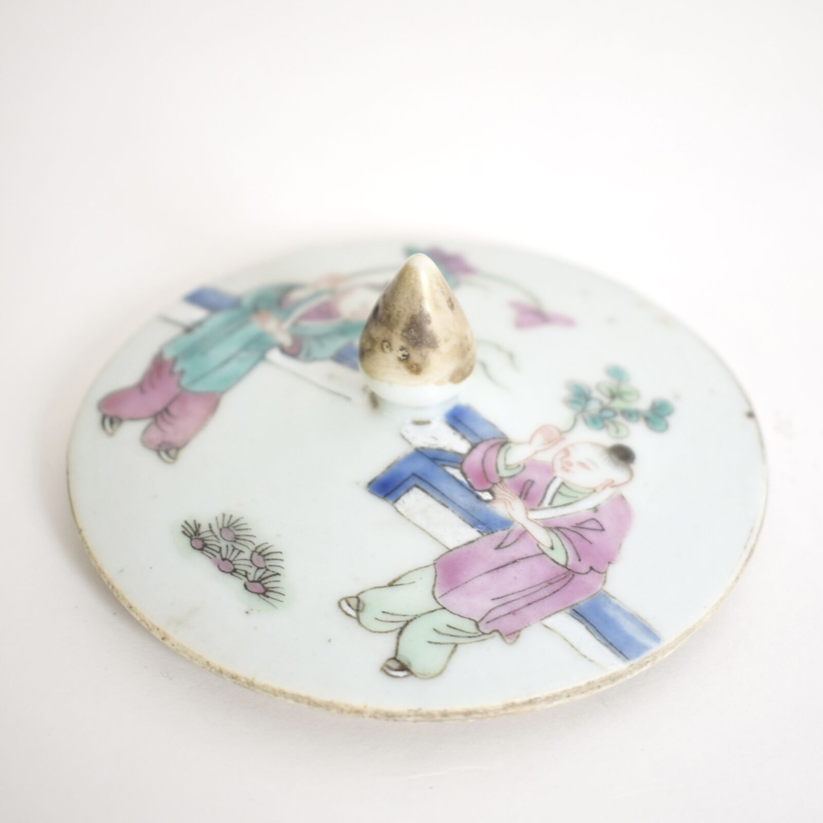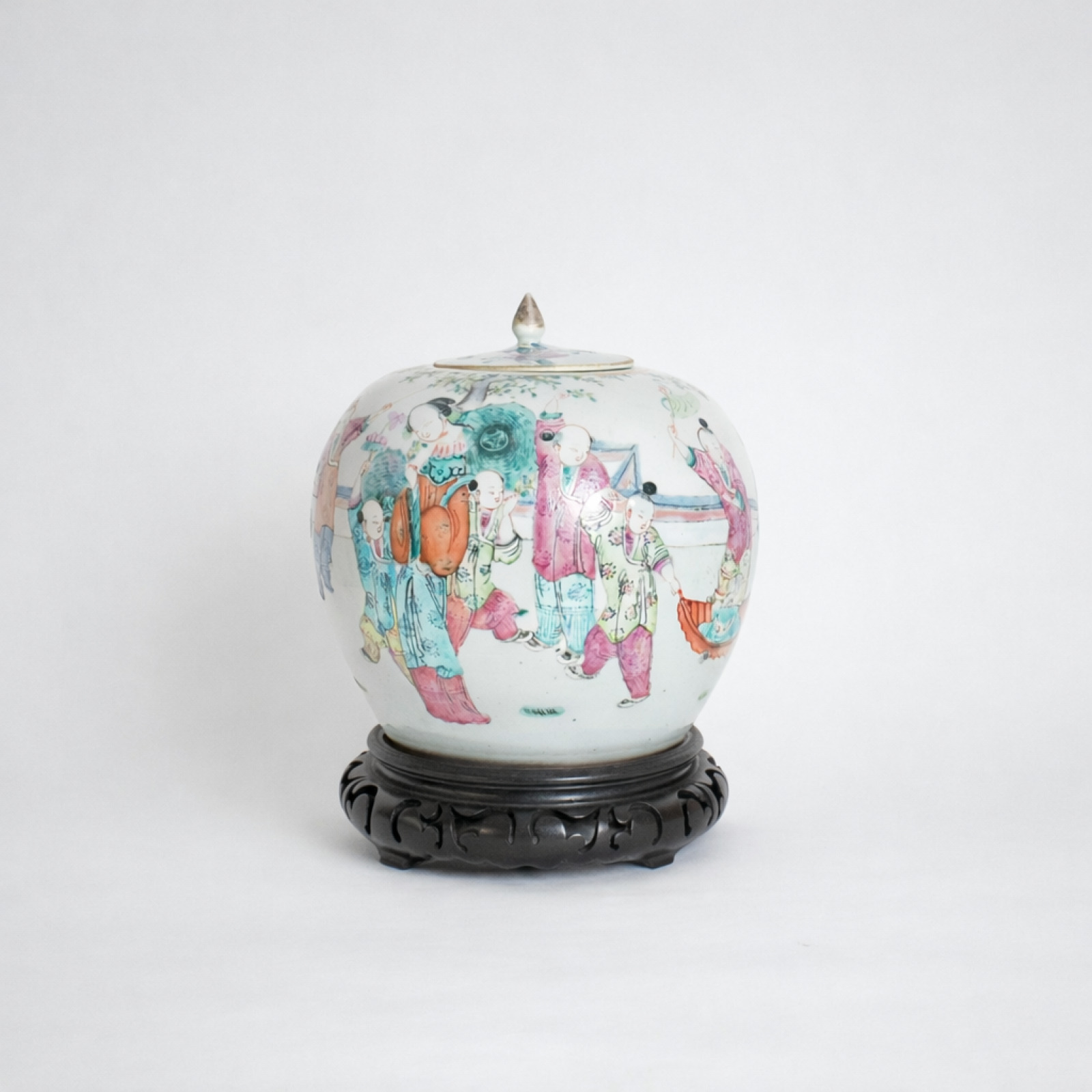 Potiche boule à couvercle, en porcelaine émaillée polychrome dans le goût de la famille rose, à décor de frise figurative représentant des enfants jouant. H. 19 cm (usures).