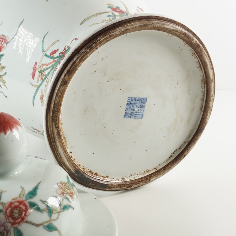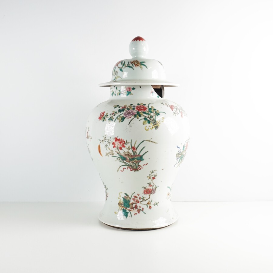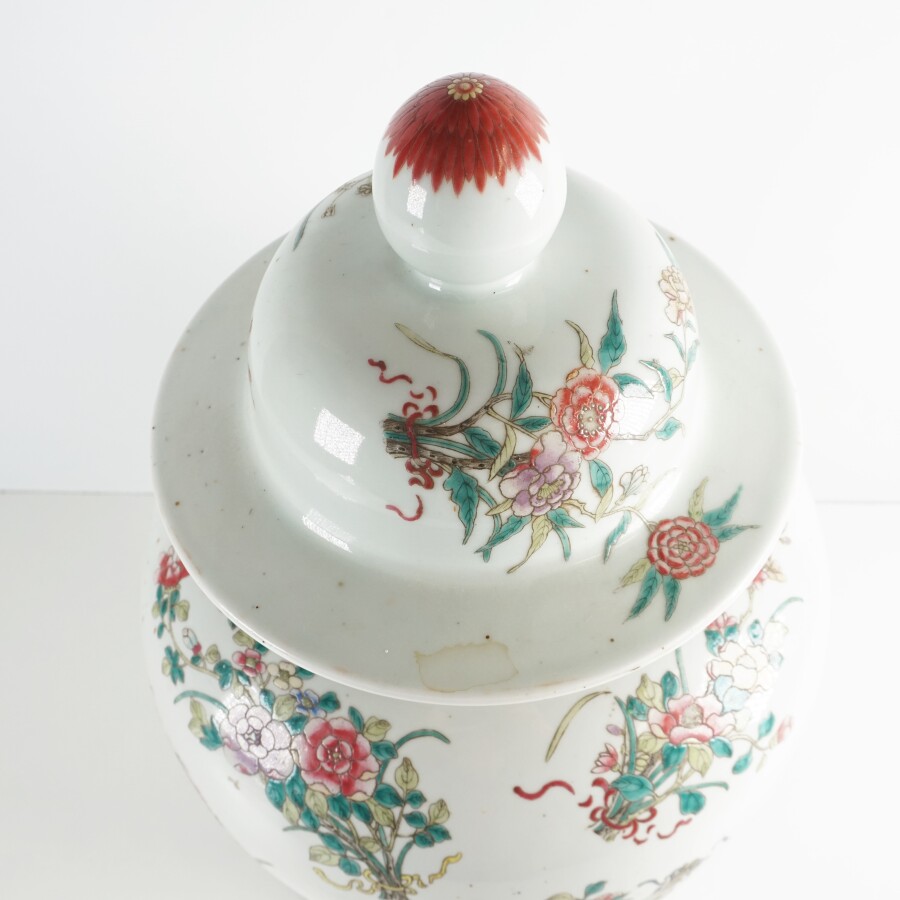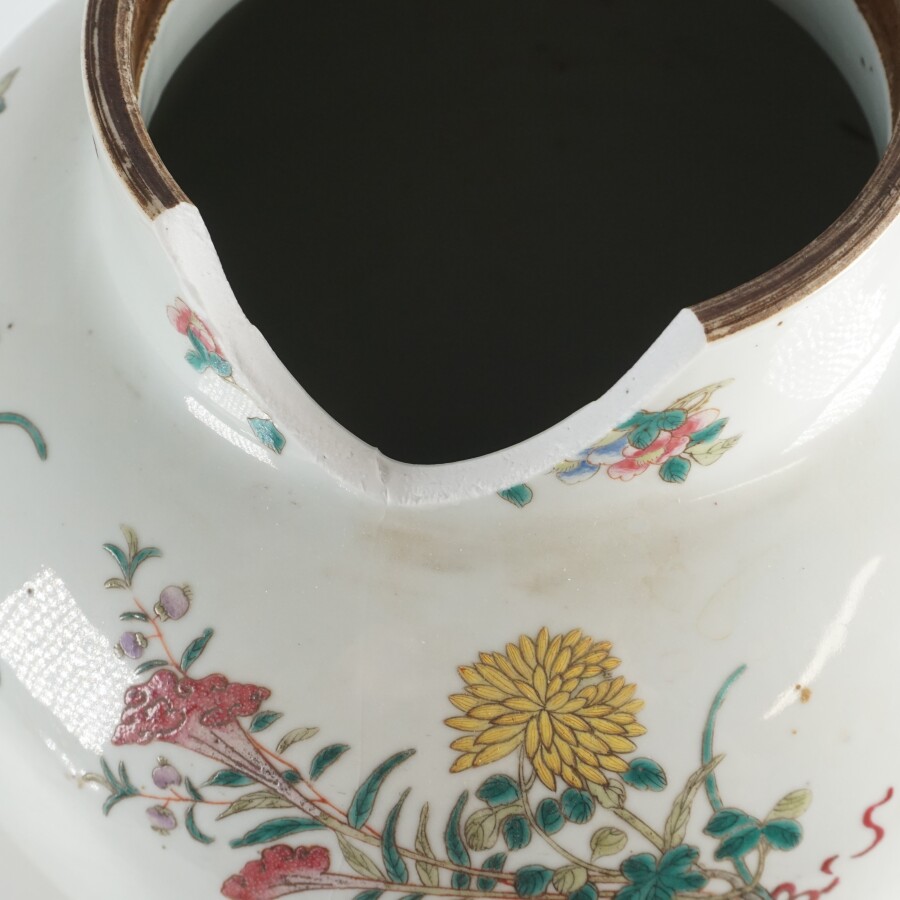 Potiche couverte de forme balustre en porcelaine et émaux de la famille rose, à décor de fleurs dont lotus, pivoines et chrysanthèmes, période de la Première République (1911 - 1920), Chine, H. 48 cm (accident au col, légères rayures d'émail).