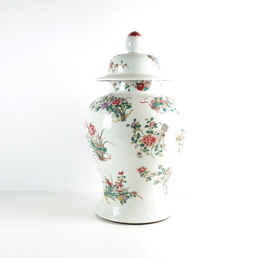 Potiche couverte de forme balustre en porcelaine et émaux de la famille rose, à décor de fleurs dont lotus, pivoines et chrysanthèmes, période de la Première République (1911 - 1920), Chine, H. 48 cm (accident au col, légères rayures d'émail).