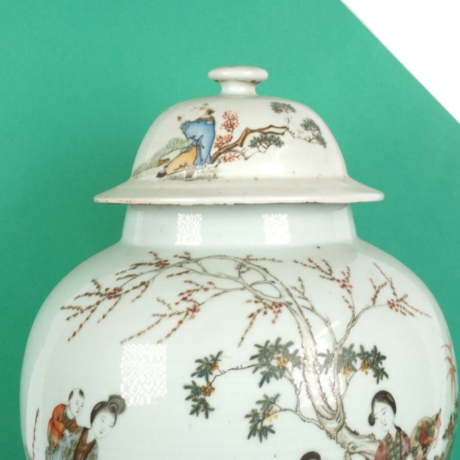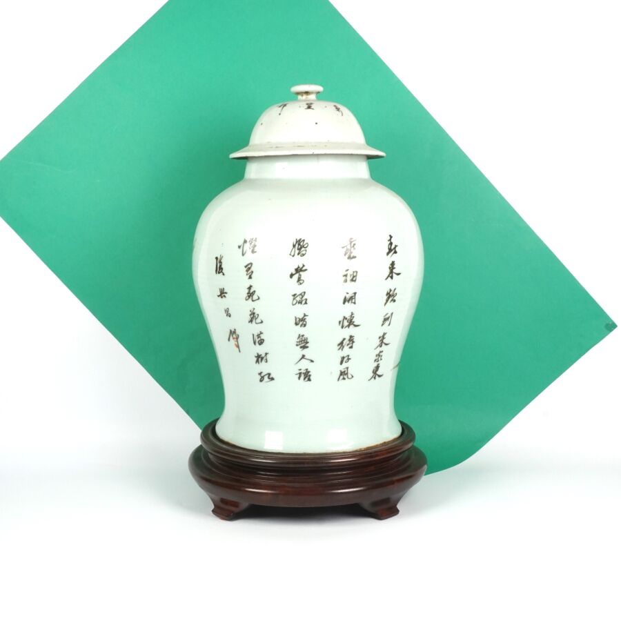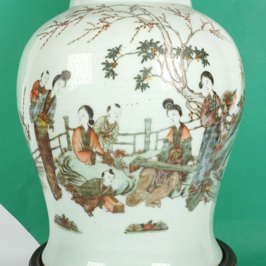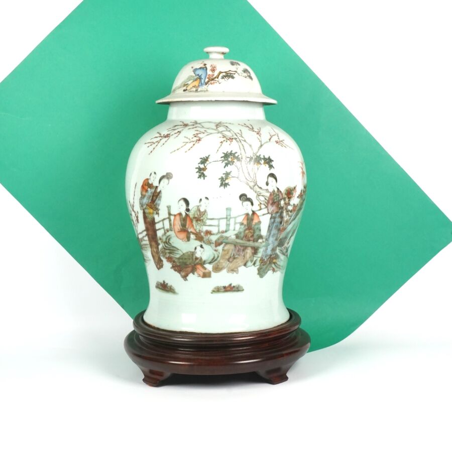 Potiche couverte en porcelaine et émaux de style famille rose à décor de femmes et d'enfants sur une terrasse arborée, à décor au revers de motifs calligraphiés, présentée avec un socle en bois, Chine, seconde moitié du 20ème siècle, H. 41 cm (fêle au couvercle et au col).
