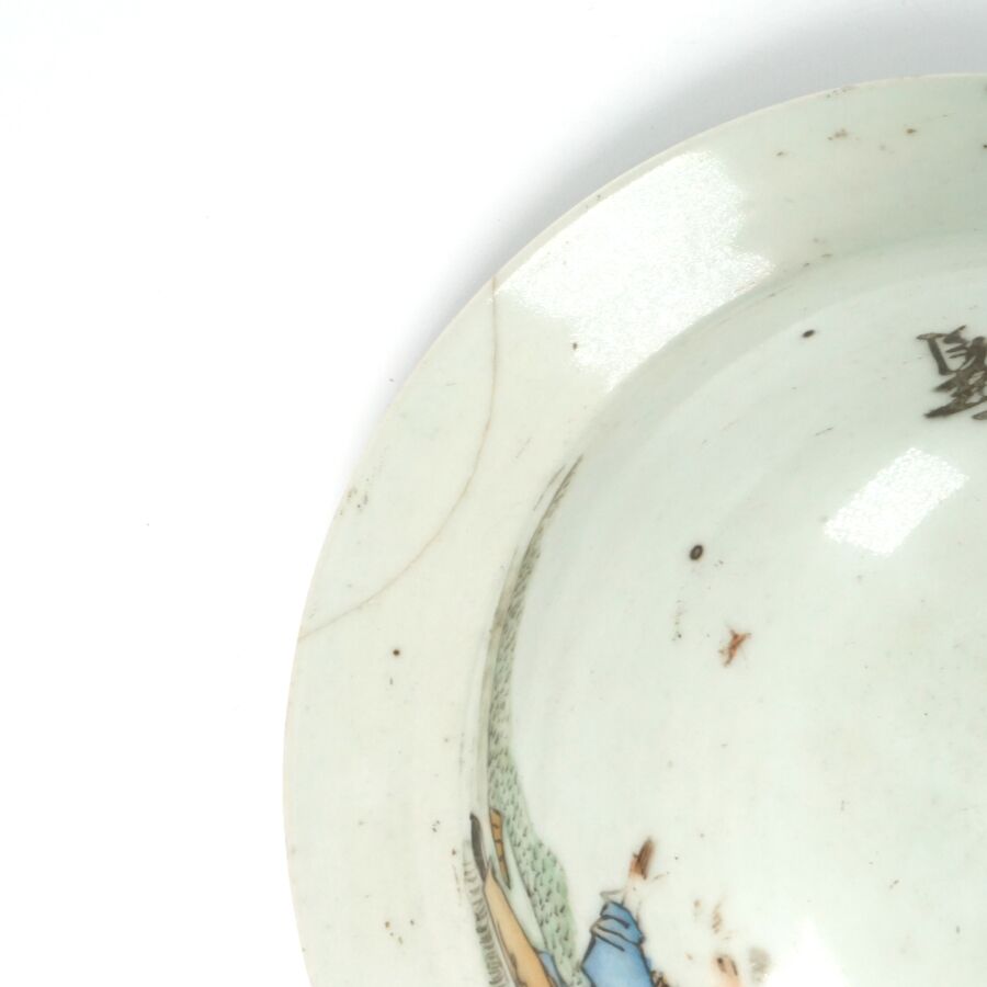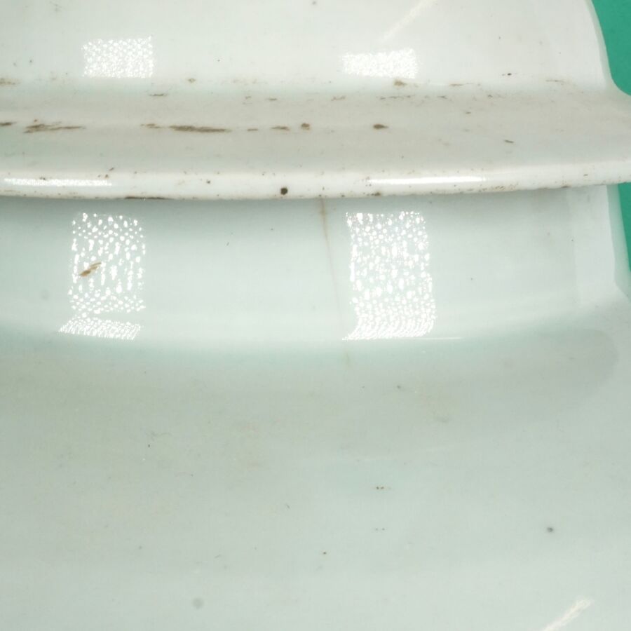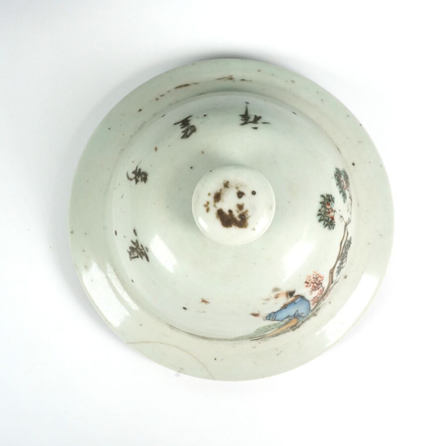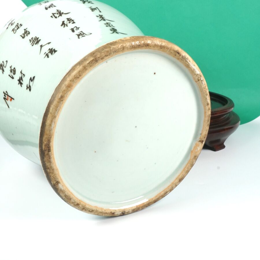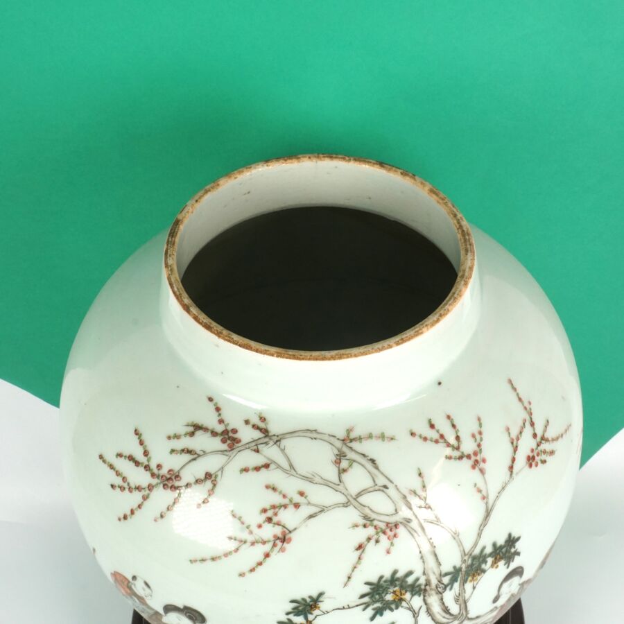 Potiche couverte en porcelaine et émaux de style famille rose à décor de femmes et d'enfants sur une terrasse arborée, à décor au revers de motifs calligraphiés, présentée avec un socle en bois, Chine, seconde moitié du 20ème siècle, H. 41 cm (fêle au couvercle et au col).