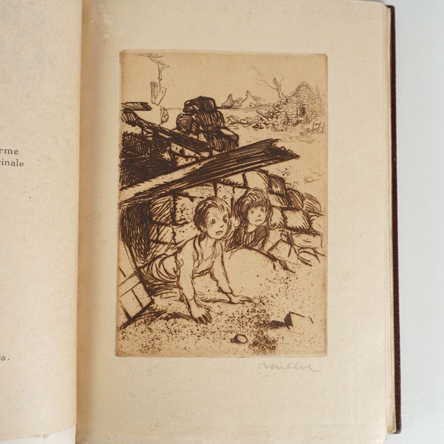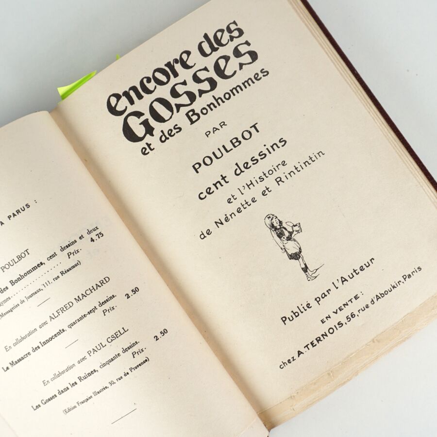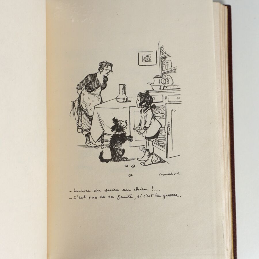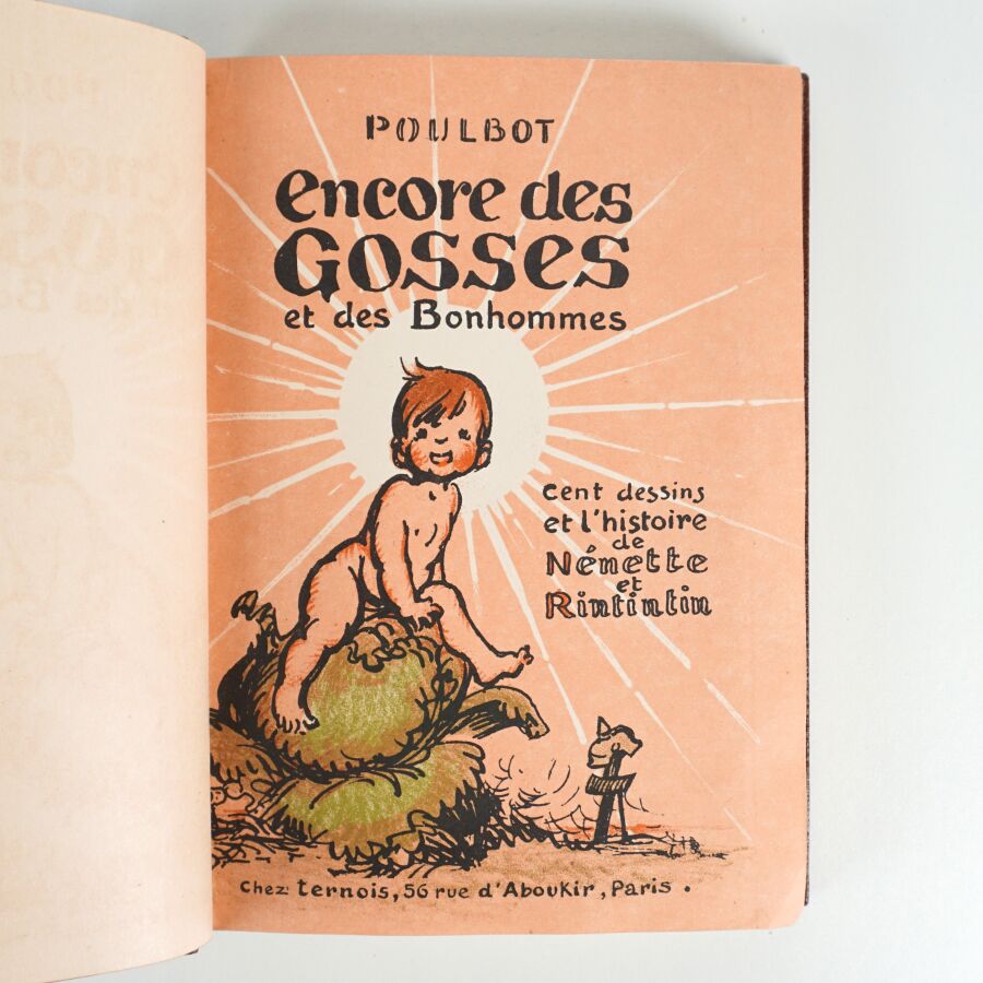 POULBOT (Francisque). Encore des gosses et des bonhommes, cent dessins et l'histoire de Nénette et Rintintin. Paris, Publié par l'auteur, s. d.. In-8, maroquin brun, dos à nerfs, auteur et titre dorés, dos et plats ornés de figures mosaïquées (enfants et fleurs), contreplats bordés de maroquin à décor mosaïqué, tranches dorées, couv. illustrée et dos conservés, ex. non rogné, étui bordé (G. Levitzky). Un des 100 ex. numérotés et signés sur vieux Japon à la forme augmentés d'une EAU-FORTE ORIGINALE signée par l'artiste. Illustrations in et hors texte par Poulbot. Très bel exemplaire dans une reliure mosaïquée.