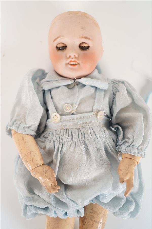 Poupée Bleuette (?) tête porcelaine marquée en creux "26 FRANCE SFBJ PARIS 8/0", yeux bleus dormeurs avec cils, corps articulé : tronc 2, pieds 1, barboteuse et perruque, H. 27 cm.