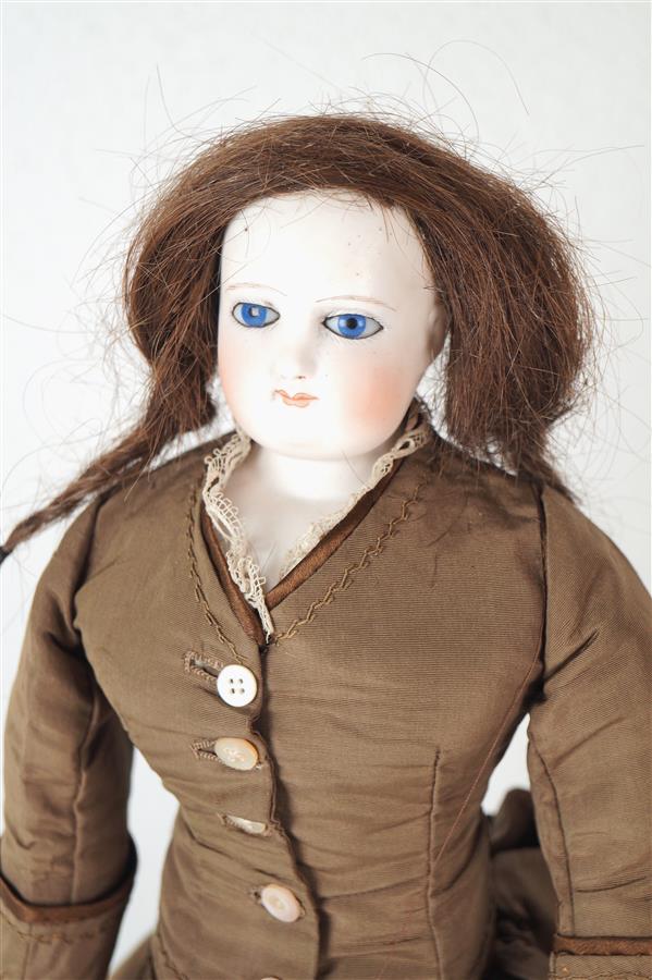 Poupée parisienne, tête fixe et buste en biscuit, yeux bleus émaillés en amande, corps en peau et articulations à goussets, tenue en taffetas marron en partie d'époque, H. 40 cm (état moyen).