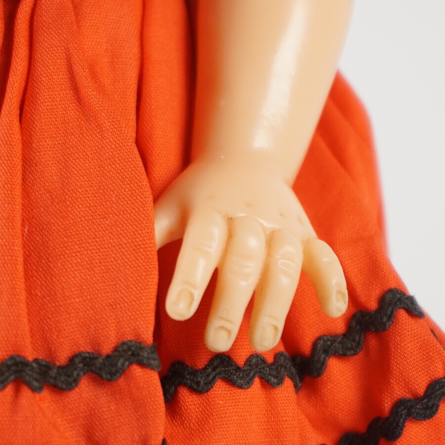 Poupée "Shirley Temple", tête et corps en caoutchouc, yeux fixes et bouche ouverte, L. 36 cm, (B.E.)