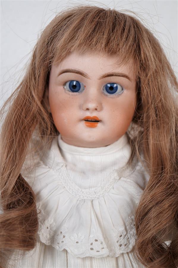 Poupée tête porcelaine DEP, taille 4, yeux bleus anciennement dormeurs, corps SFBJ, habits et perruque, H. 39 cm.