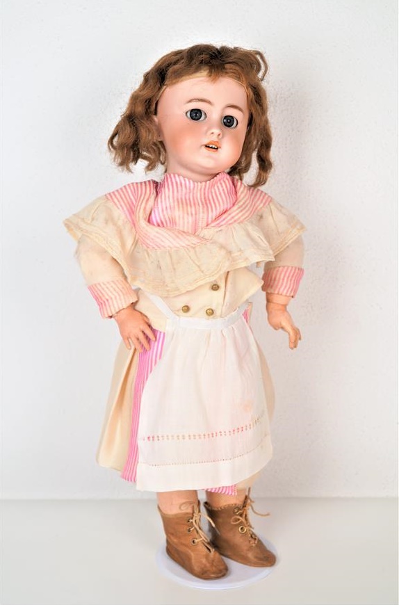 Poupée tête porcelaine DEP taille 7, yeux bleus dormeurs, corps articulé, habits et perruque, H. 44 cm (une main restaurée).