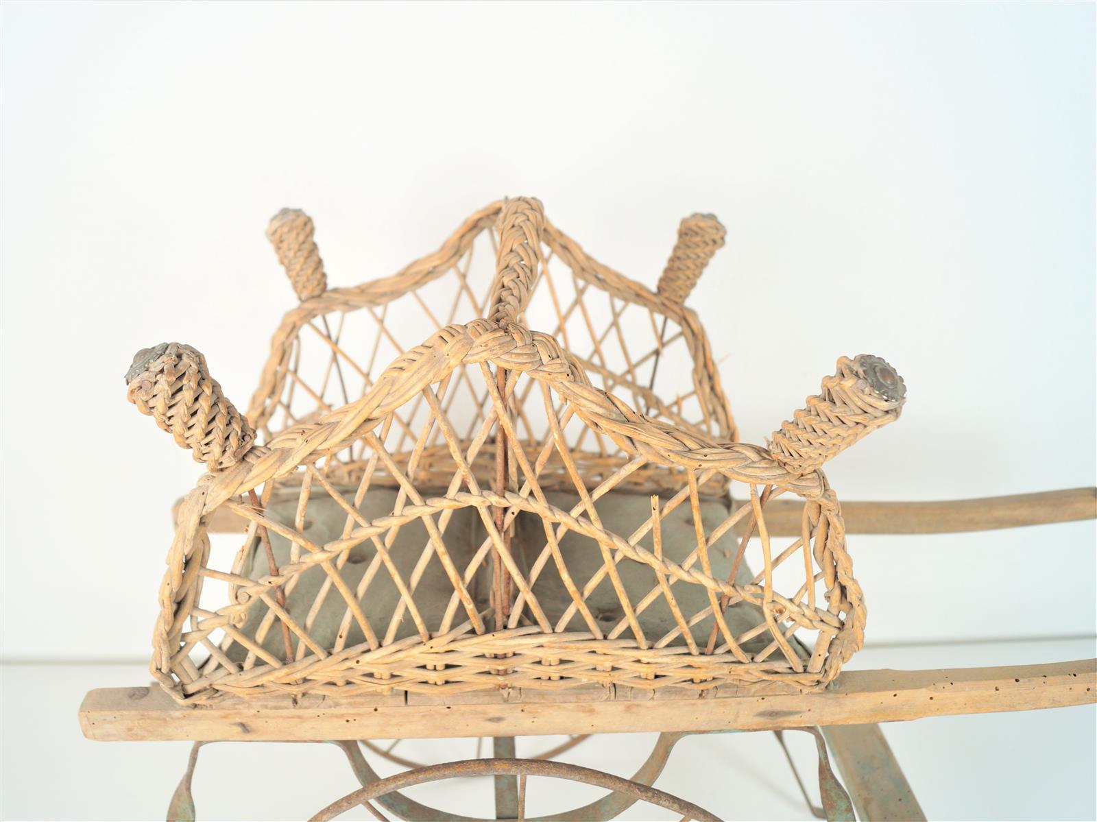 Poussette pour jumeaux en osier, roues en fer, L. 80 cm (accidents).