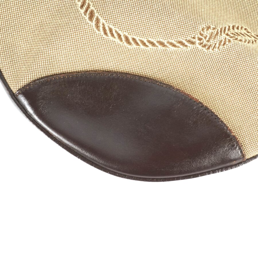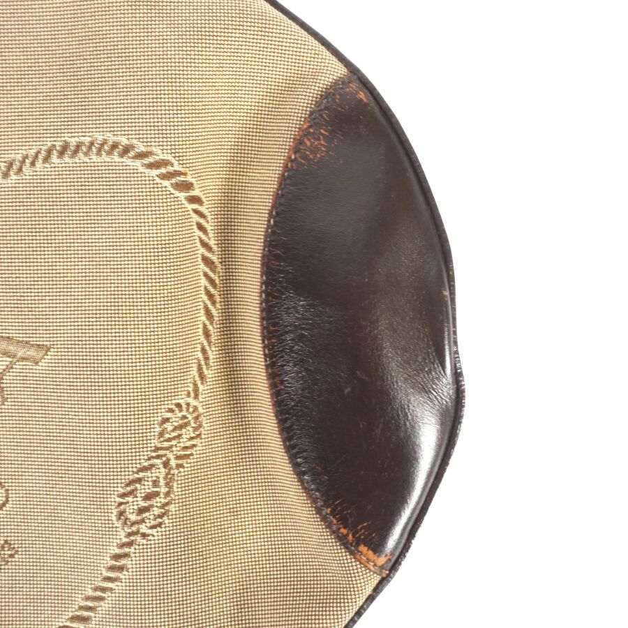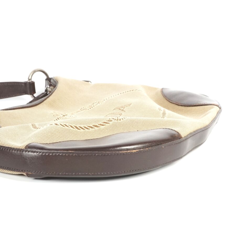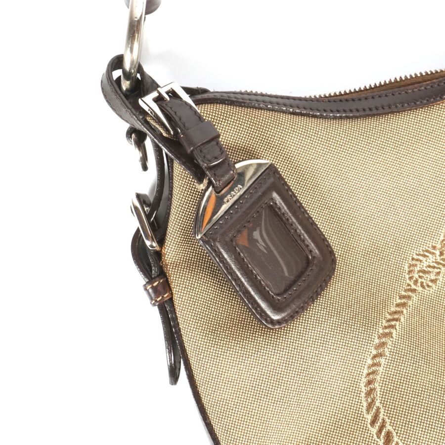 PRADA : Sac à main en toile dite Jacquard beige logotée et empiècement en cuir de couleur marron, une anse supérieure en cuir marron et anneaux en métal argenté pour un porté épaule, fermeture principale zippée, intérieur en tissu beige logoté, pochette interne zippée avec plaque en cuir logotée, présenté avec son porte-carte en porte-clé, Dim. Hors anse : 29.5 x 38 x 2 cm (quelques usures au cuir).