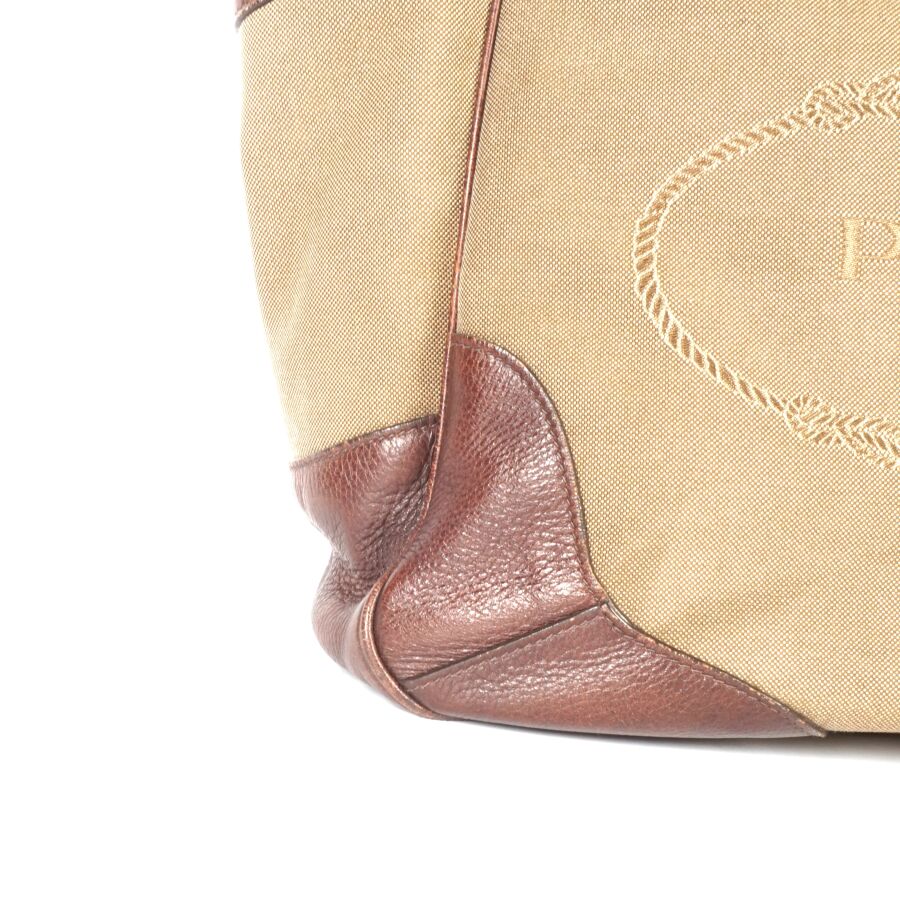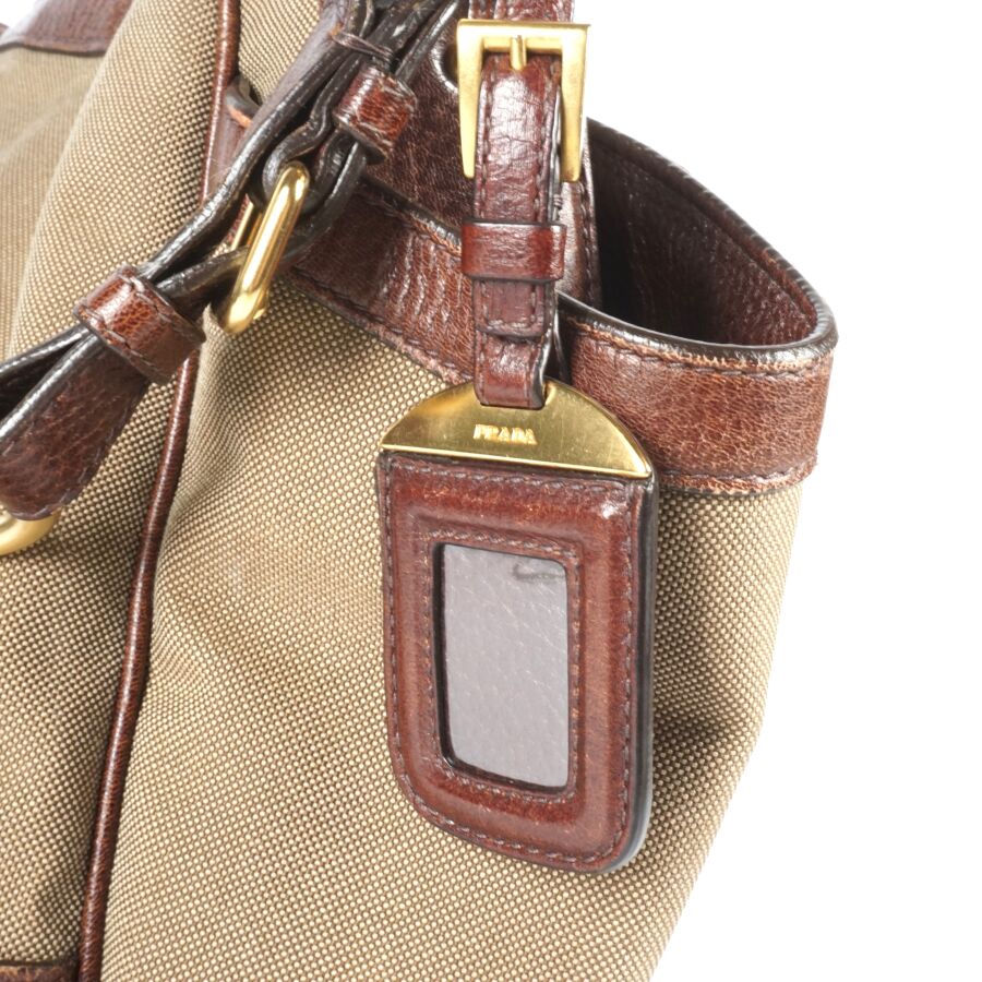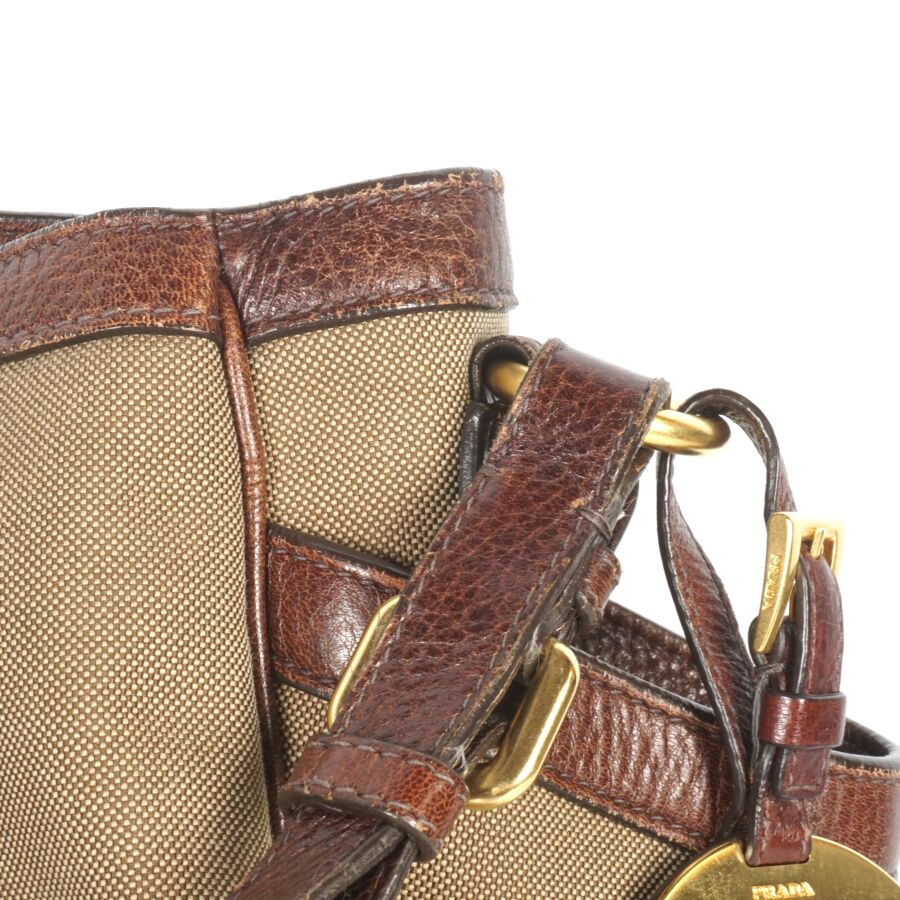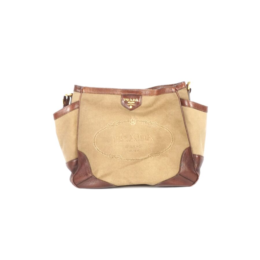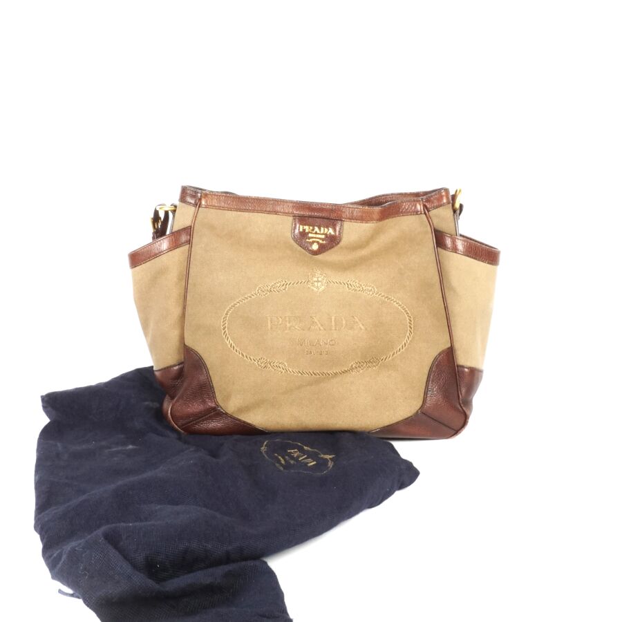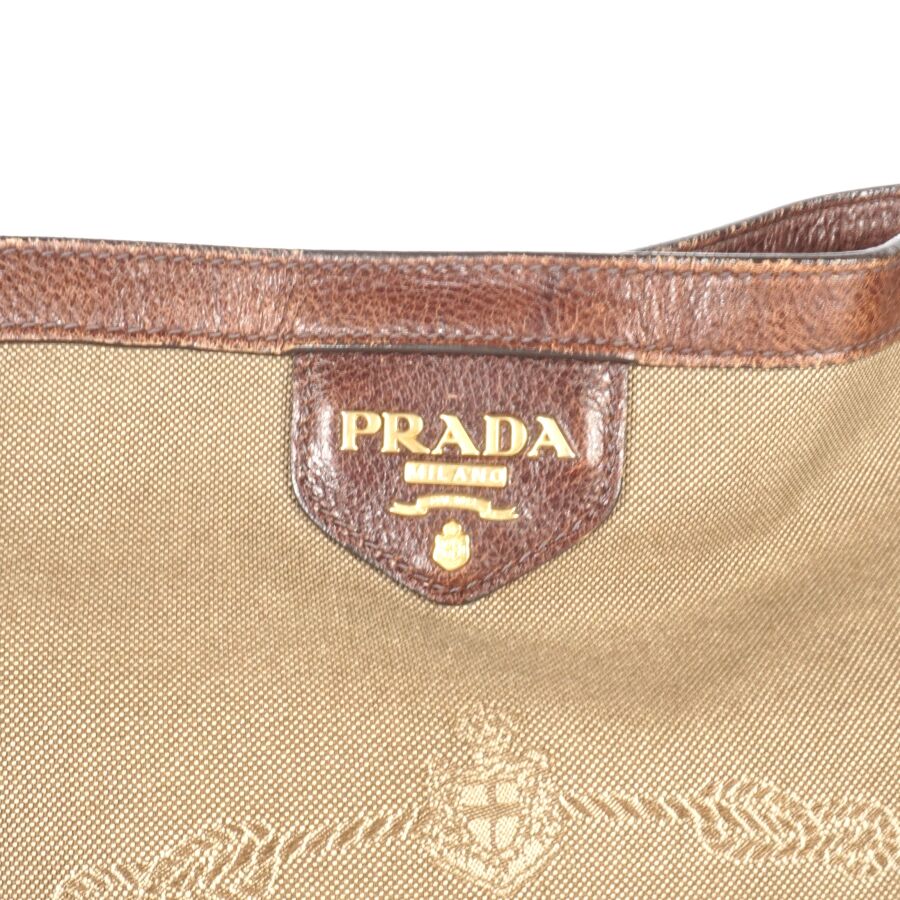 PRADA : Sac "Cabas" en toile dite Jacquard de couleur beige logotée et empiècement en cuir de couleur marron, bijouterie en métal doré, une anse supérieure pour un porté main et épaule réglable avec anneaux en métal doré deux pochettes latérales extérieures sans fermeture, fermeture principale par aimant, intérieur en tissu noir logoté, deux pochettes internes, l'une à fermeture zippée avec plaque en cuir logotée, présenté avec son porte-carte en porte-clé et son dustbag d'origine, Dim. Hors anse : 32 x 46 x 10 cm (usures).