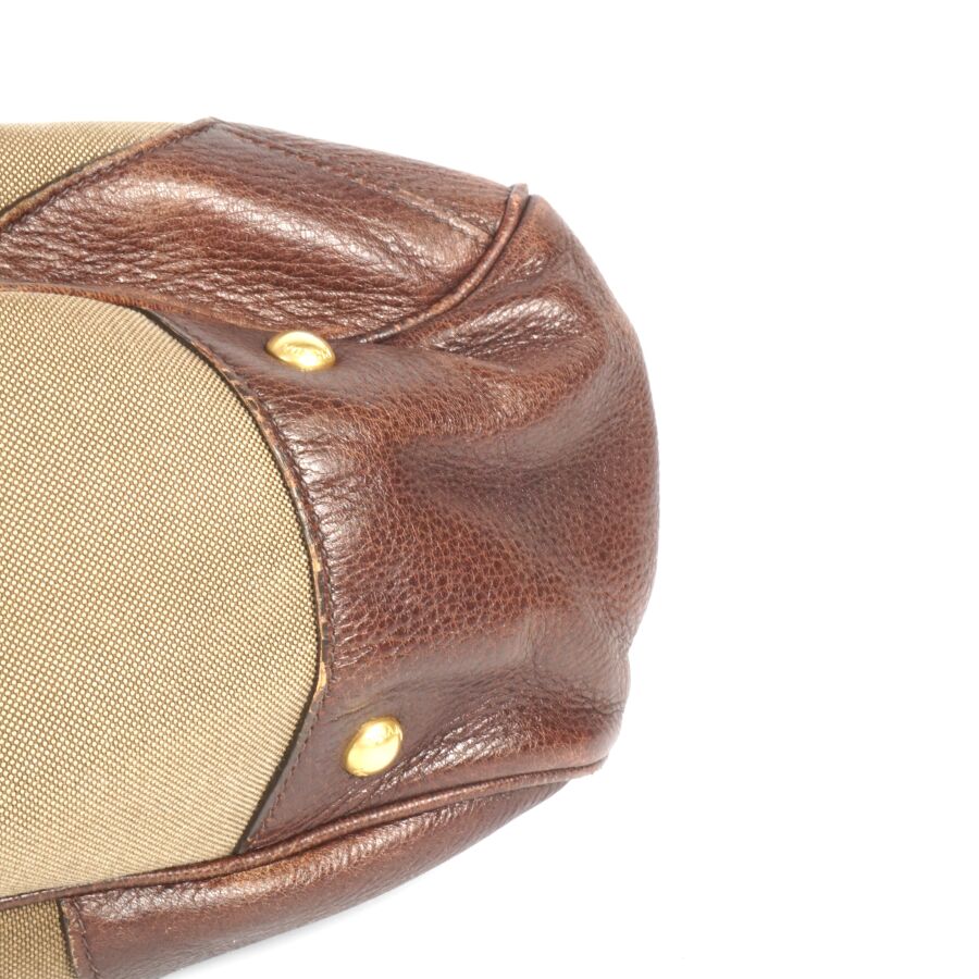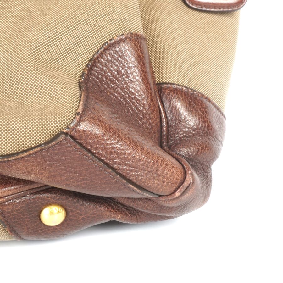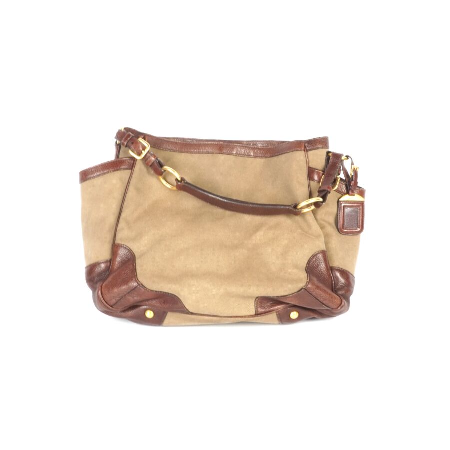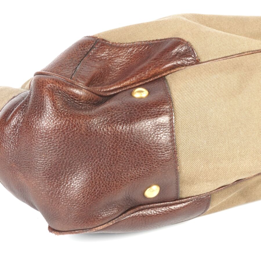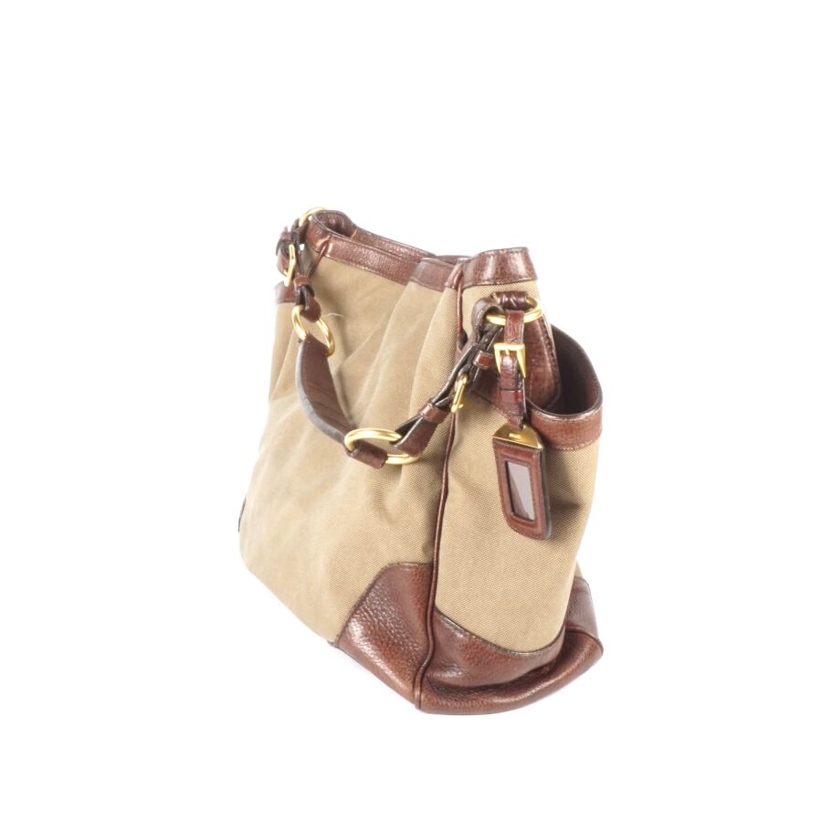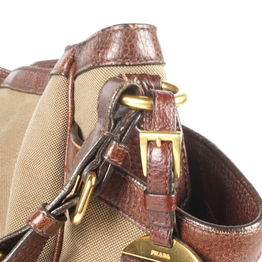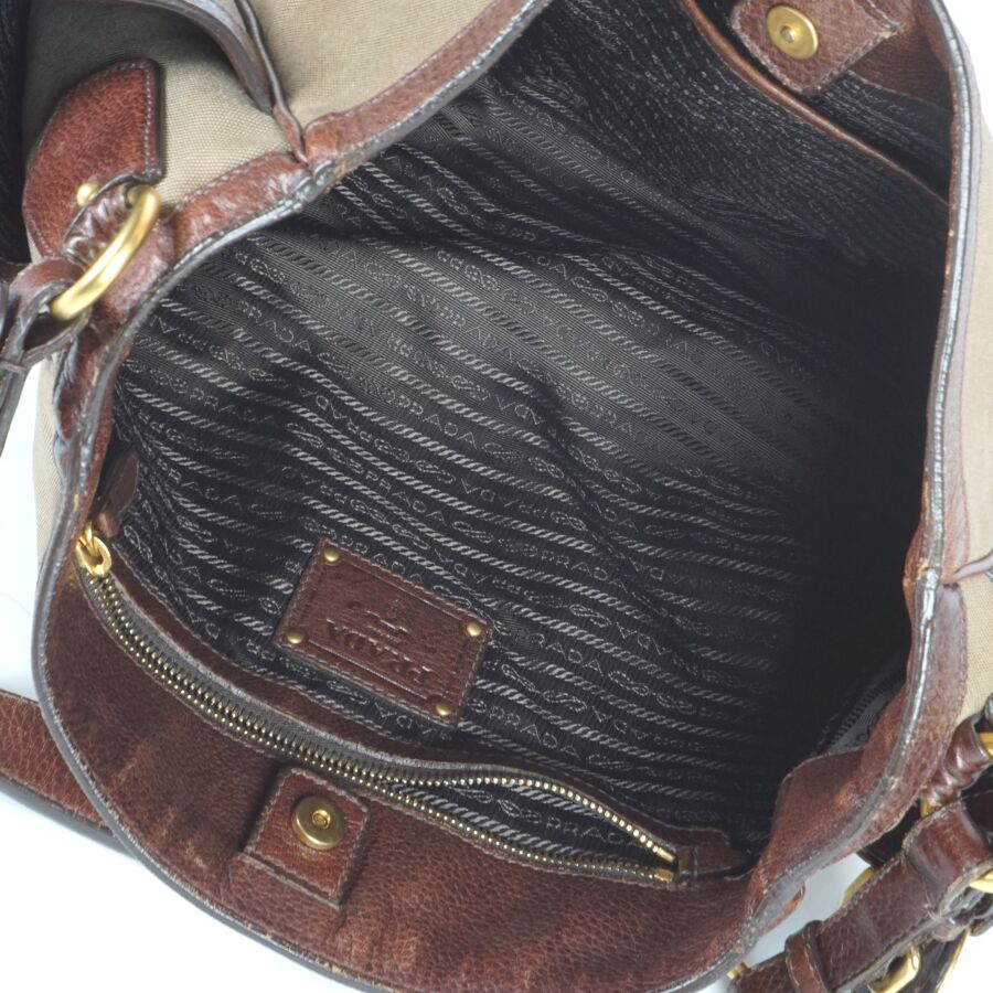 PRADA : Sac "Cabas" en toile dite Jacquard de couleur beige logotée et empiècement en cuir de couleur marron, bijouterie en métal doré, une anse supérieure pour un porté main et épaule réglable avec anneaux en métal doré deux pochettes latérales extérieures sans fermeture, fermeture principale par aimant, intérieur en tissu noir logoté, deux pochettes internes, l'une à fermeture zippée avec plaque en cuir logotée, présenté avec son porte-carte en porte-clé et son dustbag d'origine, Dim. Hors anse : 32 x 46 x 10 cm (usures).