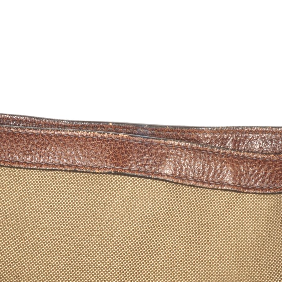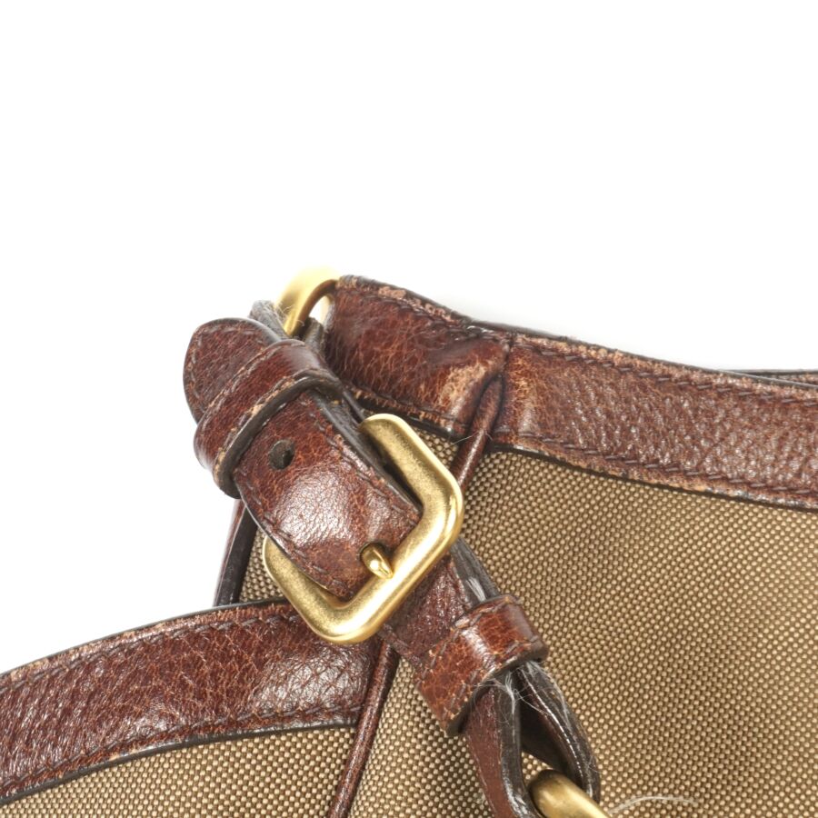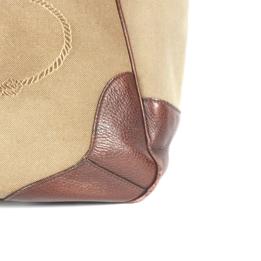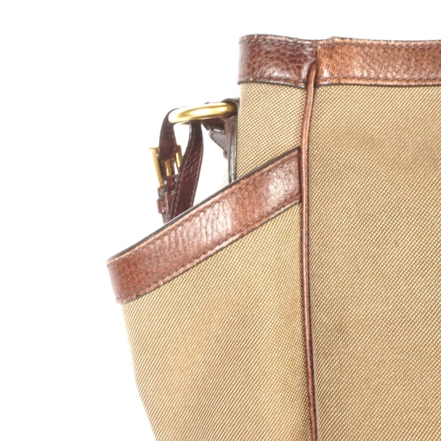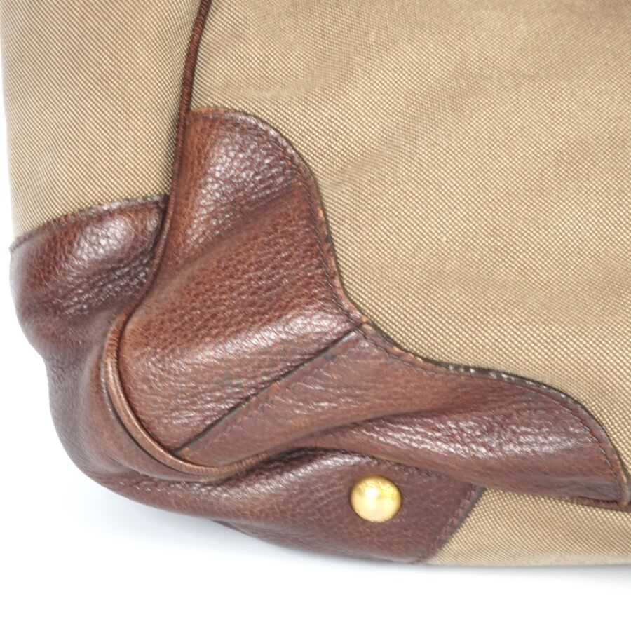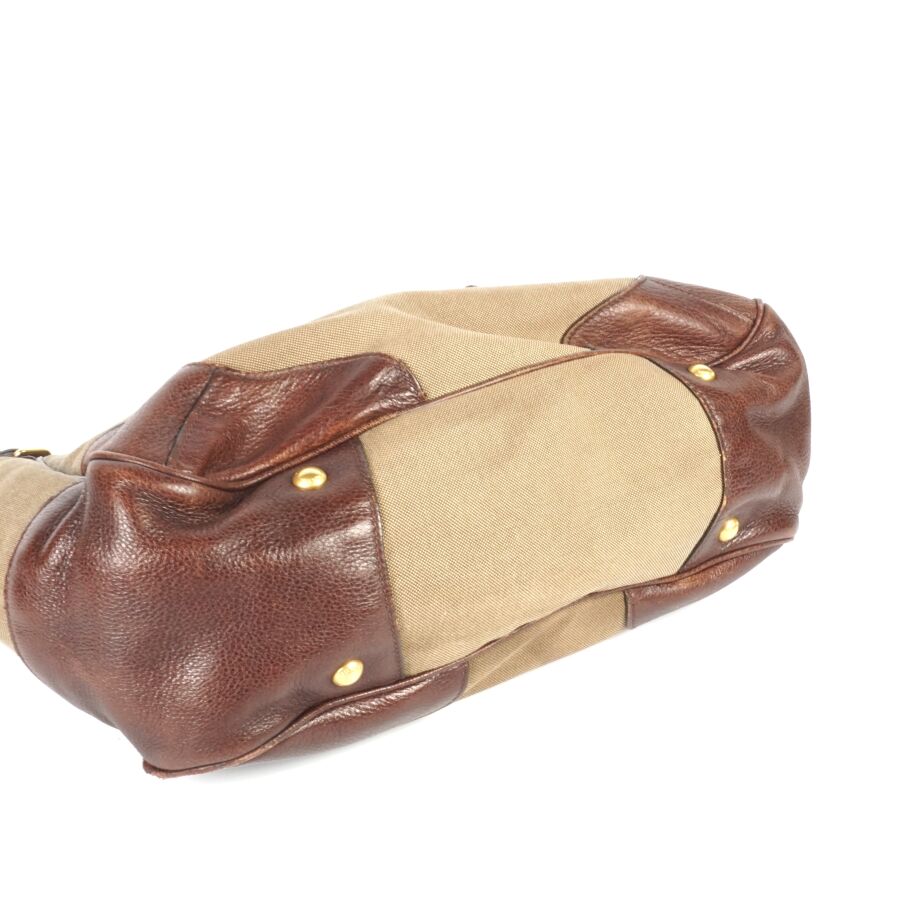 PRADA : Sac "Cabas" en toile dite Jacquard de couleur beige logotée et empiècement en cuir de couleur marron, bijouterie en métal doré, une anse supérieure pour un porté main et épaule réglable avec anneaux en métal doré deux pochettes latérales extérieures sans fermeture, fermeture principale par aimant, intérieur en tissu noir logoté, deux pochettes internes, l'une à fermeture zippée avec plaque en cuir logotée, présenté avec son porte-carte en porte-clé et son dustbag d'origine, Dim. Hors anse : 32 x 46 x 10 cm (usures).