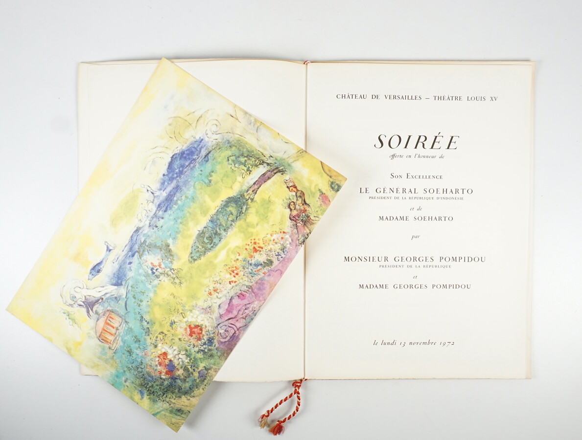[PROGRAMMES] - CHAGALL (Marc, d'après) - Château de Versailles - Théâtre Louis XV. Programme de la Soirée offerte [] par Monsieur Georges Pompidou [] le lundi 13 novembre 1972 - Sans lieu ; Bussière Arts Graphiques, [1972] - 1 volume In-folio en feuilles reliées d'1 cordelette de soie sous couverture rempliée illustrée d'1 reproduction couleurs d'1 décor de Marc Chagall, 1 planche couleurs hors texte (décor de Chagall pour Daphnis et Chloé) - Très bon exemplaire - On y joint : PIGNON (Ernest, d'après) - Château de Versailles - Théâtre Louis XV. Programme de la Soirée offerte [] par Monsieur Georges Pompidou [] le lundi 9 avril 1973 - Sans lieu ; Imprimerie Nationale, [1973] - 1 volume In-folio en feuilles reliées d'1 cordelette de soie sous couverture rempliée illustrée d'1 composition couleurs de Ernest Pignon au 1er plat, photogravures et illustrations d'Ernest Pignon in et hors texte - Très bon exemplaire.