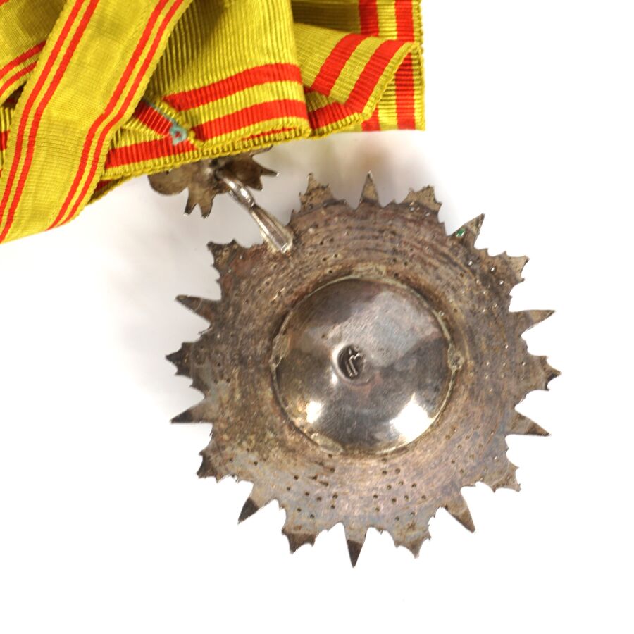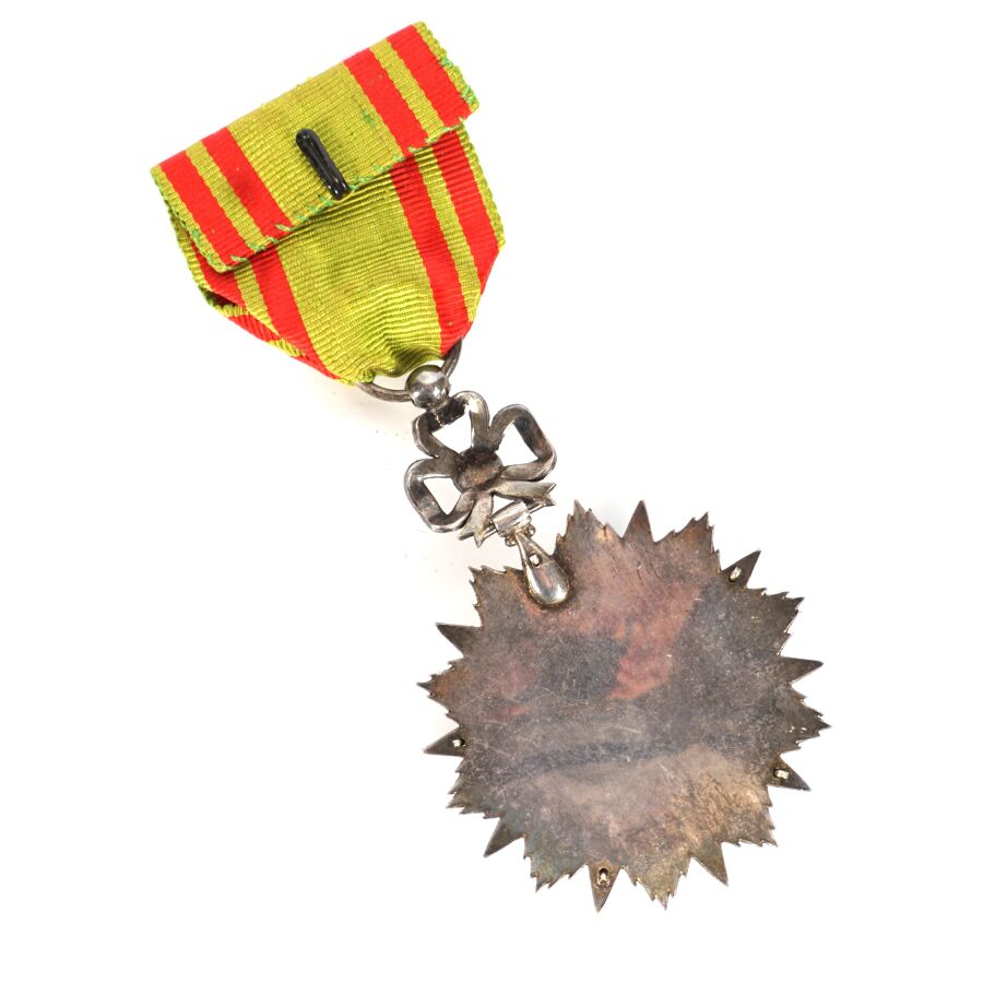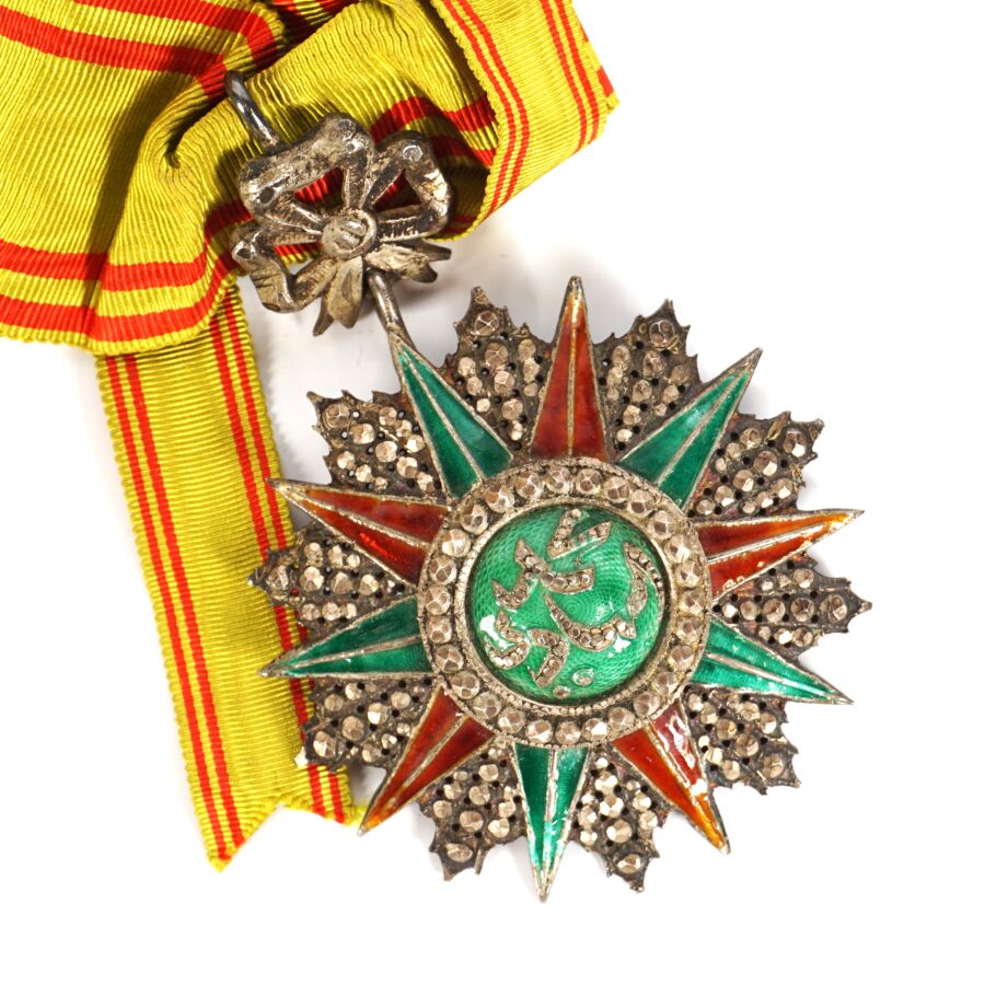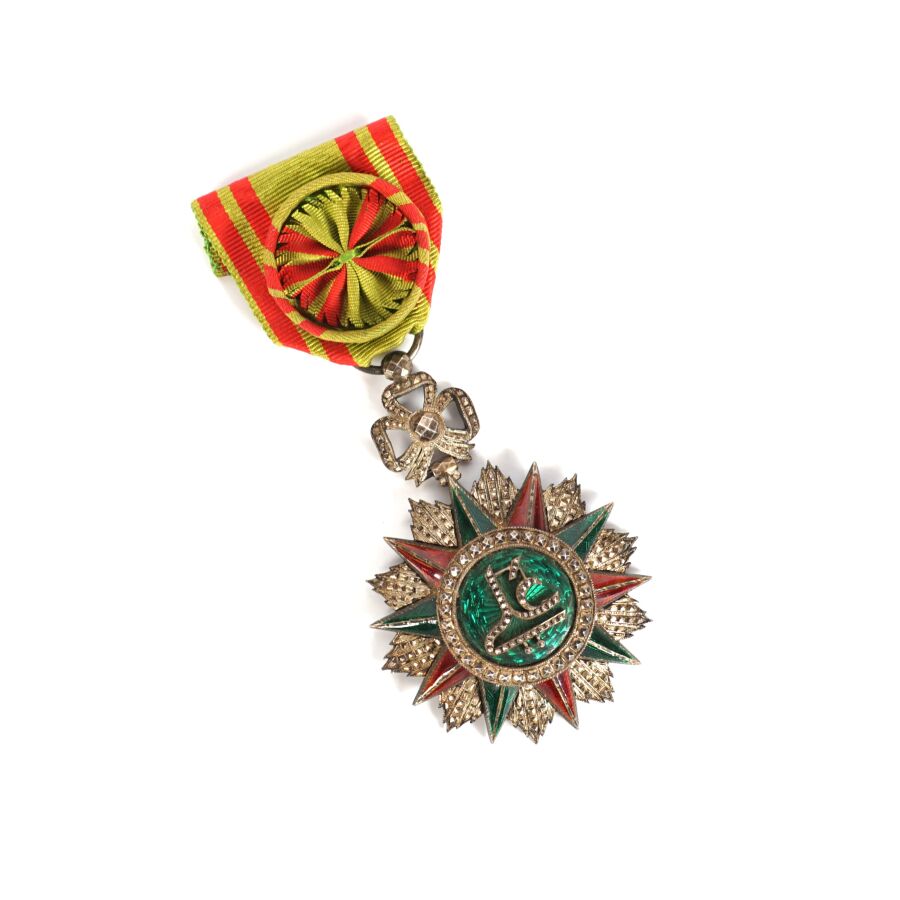 PROTECTORAT DE TUNISIE - ORDRE DU NICHAN AL IFTIKHAR (vers 1835) - Ensemble comprenant : REGNE D 'ALI-BEY (1882-1902) - INSIGNE D'OFFICIER, fabrication française en argent ciselé et émail, poinçon à la tête de sanglier, 50 x 68 mm, modèle travaillé en pointes de diamant, étoile rapportée en argent et émail, ruban de 37 mm de large avec rosette et REGNE DE MOHAMED EL HADI (1902-1906) - INSIGNE DE COMMANDEUR, fabrication tunisienne en argent ciselé et émail, 60 x 85 mm, cravate avec cordonnets, SUP.