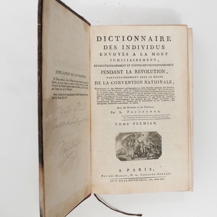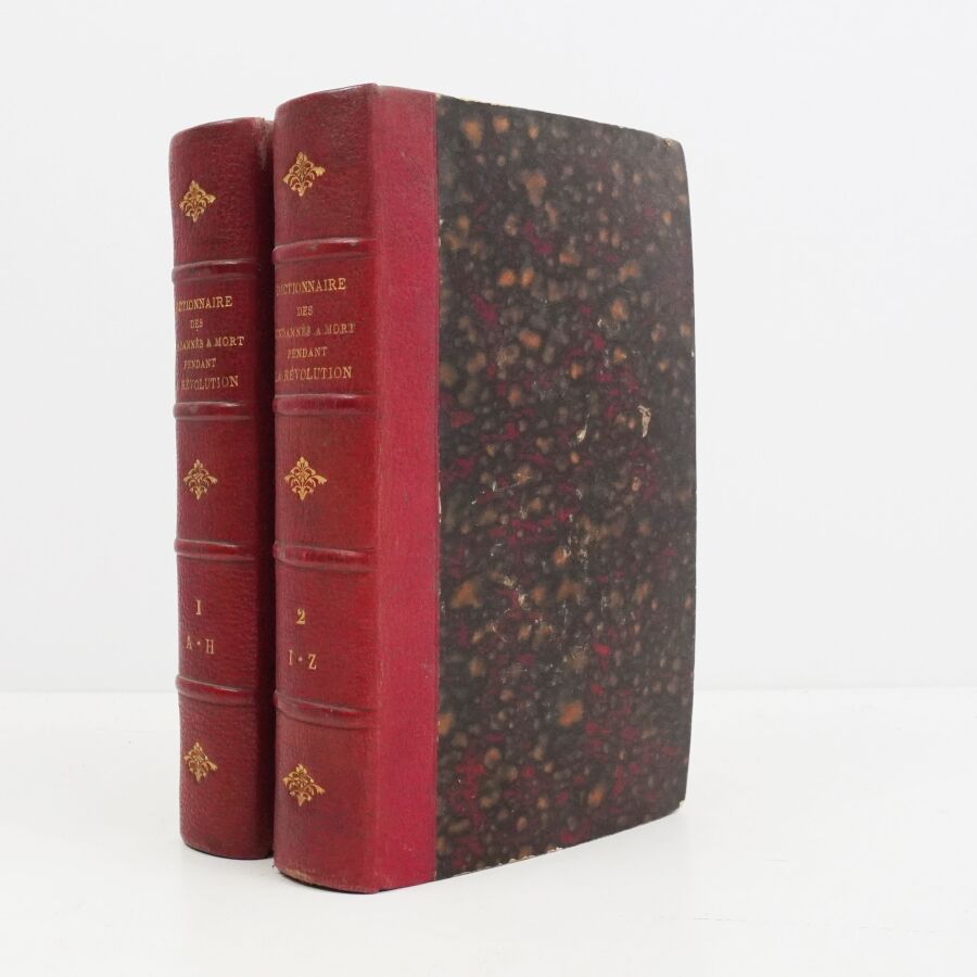 PRUDHOMME (Louis). Dictionnaire des individus envoyés à la mort judiciairement, revolutionnairement et contre-révolutionnairement, pendant la Révolution, particulièrement sous le règne de la Convention nationale […] Avec des gravures et des tableaux. Paris, Rue des Marais, 1796-1797. 2 vol. in-8, demi-maroquin rouge, dos à nerfs orné, titre et tomaison dorés (reliure de l'époque).