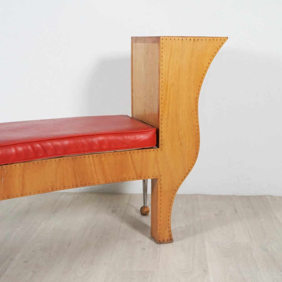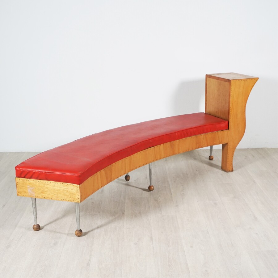 Pucci De ROSSI (1947-2013) : Banquette arquée, la structure en bois clair, un accotoir ondulé formant une partie du piétement, les cinq autres pieds tubulaires en aluminium terminant par une boule en bois, l'assise garnie d'une galette en simili cuir rouge, annotée en dessous.