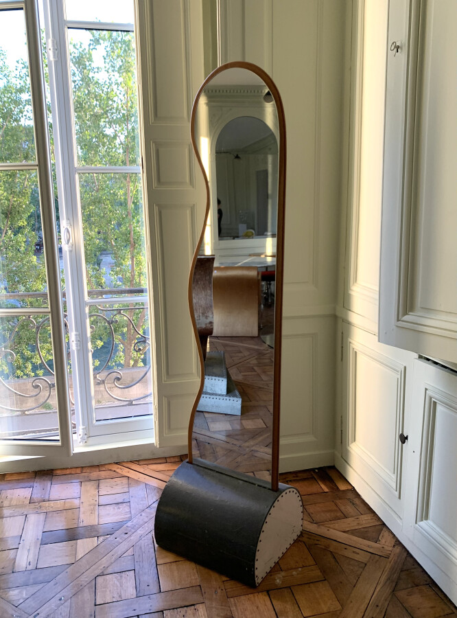 Pucci De ROSSI (1947-2013) : Miroir "Dalinien" double face, de forme mouvementée asymétrique, accueilli dans un socle en demi-lune, bois, feuilles de plomb et PVC clouté.