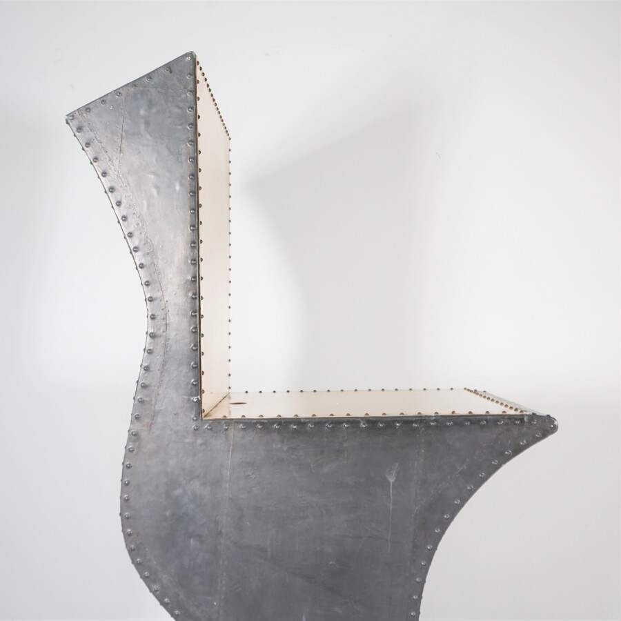 Pucci De ROSSI (1947-2013) : "Trono Kolbuki", grand trône formant meuble de télévision, le dossier sinueux ouvrant à un abattant, structure en bois recouverte d'une feuille de plomb cloutée, la base circulaire recouverte de PVC beige clouté, signé et annoté au-dessous.