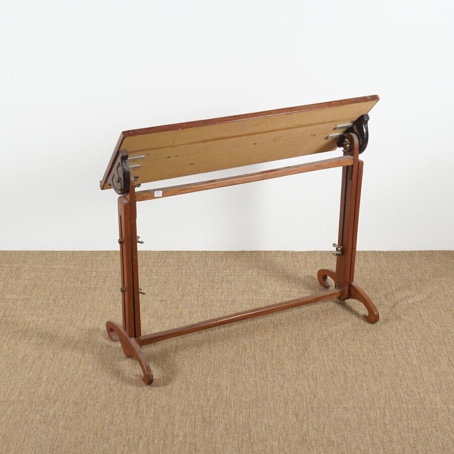 Pupitre bas, structure en bois, le plateau marqueté à décor abstrait de formes géométriques, H. 71 cm. L. 78 cm (petites usures légères).