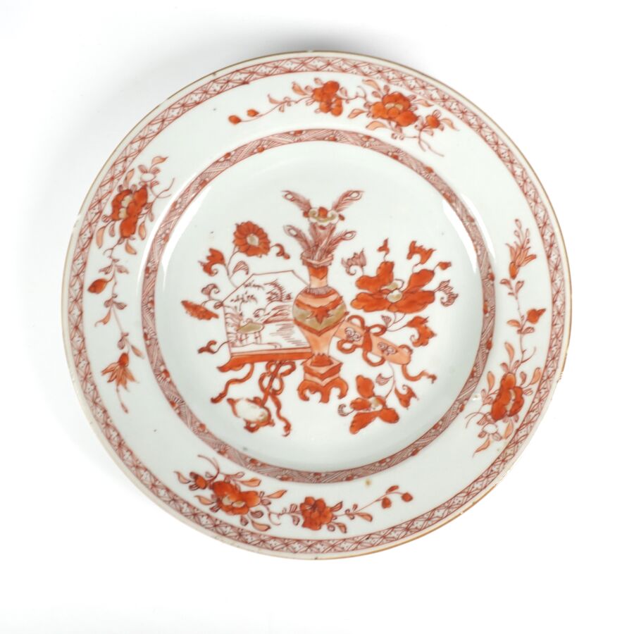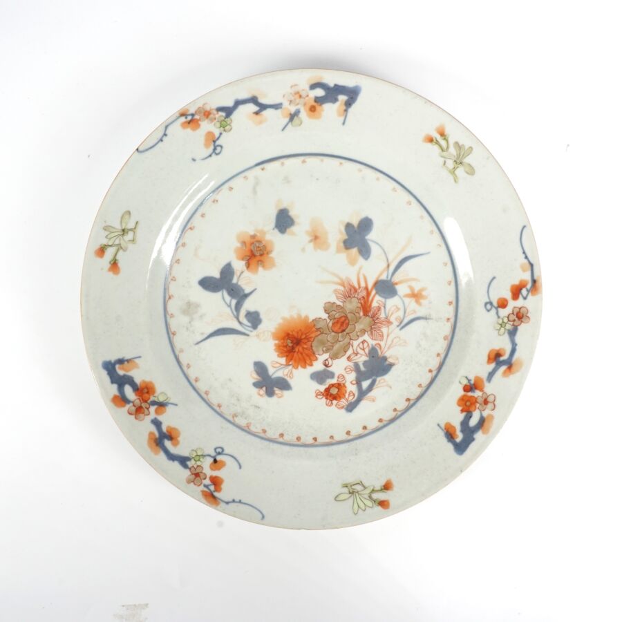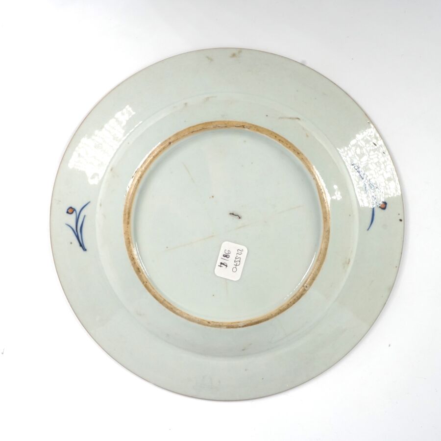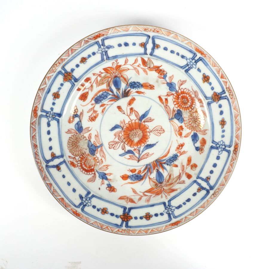 Quatre assiettes en porcelaine émaillée à décor dit Imari d'objets mobiliers et compositions florales, Chine ou Japon (?), D. 22.5 cm. 23 cm. 22.8 cm et 22.5 cm (petits éclats en bordure, fond étoilé pour l'une).