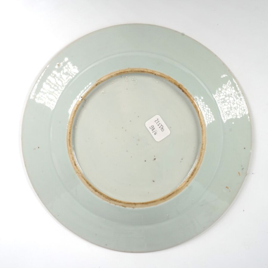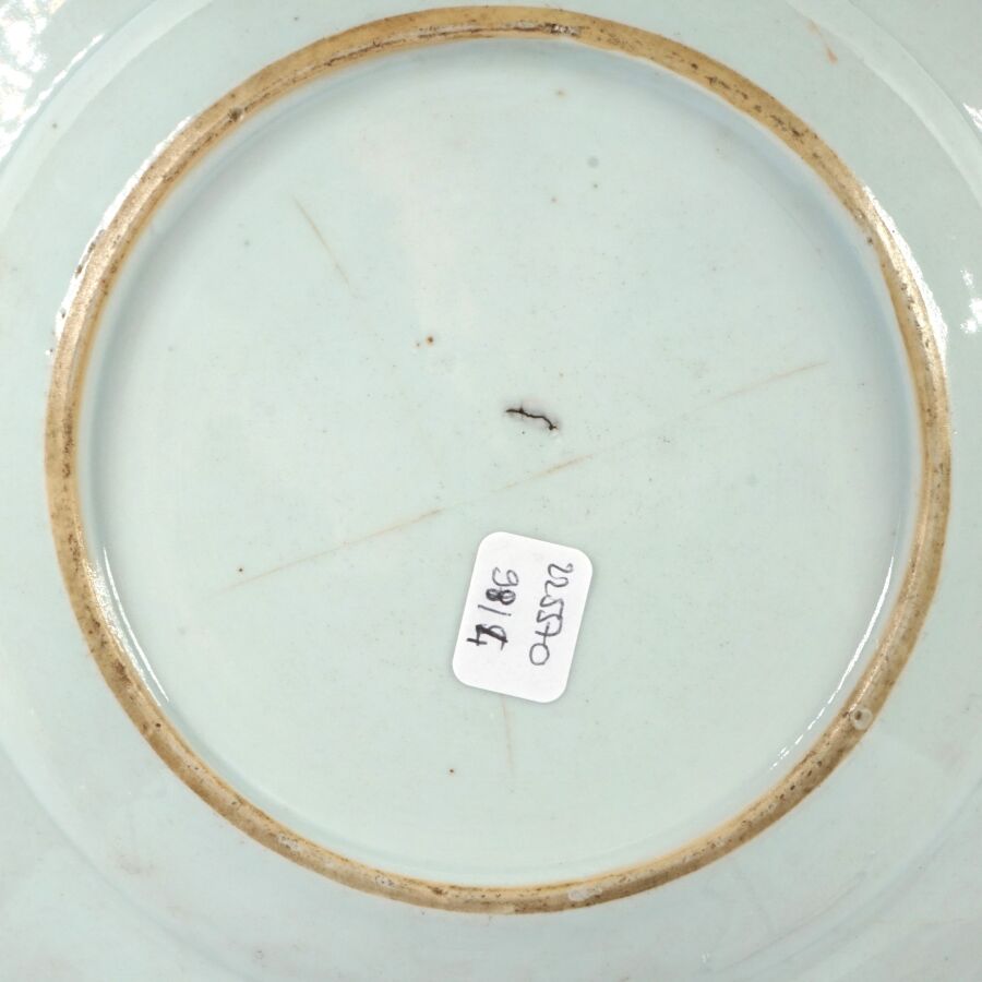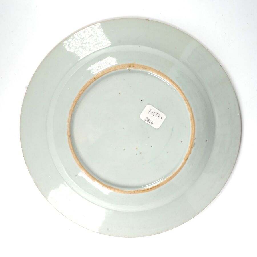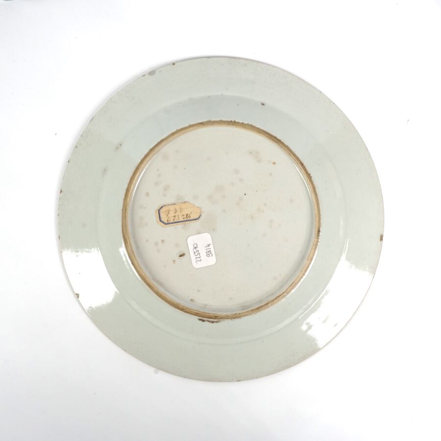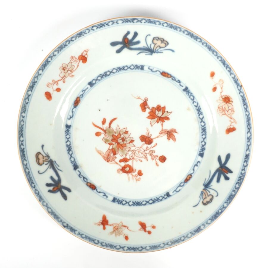 Quatre assiettes en porcelaine émaillée à décor dit Imari d'objets mobiliers et compositions florales, Chine ou Japon (?), D. 22.5 cm. 23 cm. 22.8 cm et 22.5 cm (petits éclats en bordure, fond étoilé pour l'une).