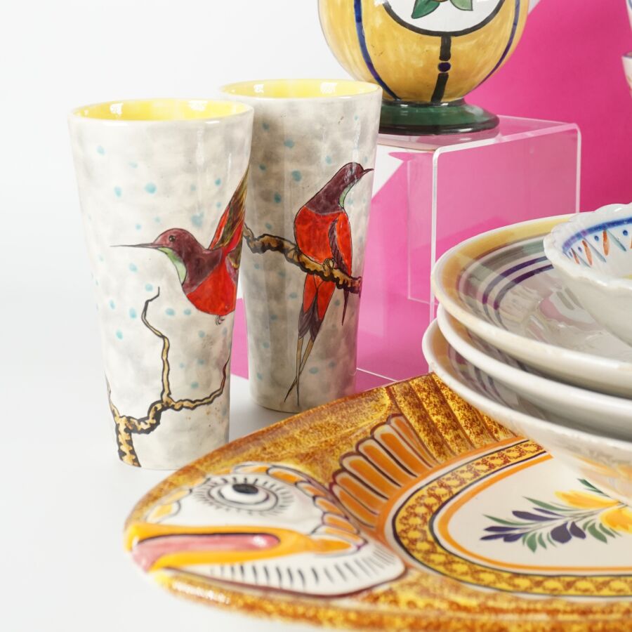QUIMPER : Ensemble de faïence émaillée polychrome dont plat, assiettes, ramequins, tasses, vases et divers, comprenant notamment Keraluc, Henriot et HB (divers formats, usures, quelques éclats).