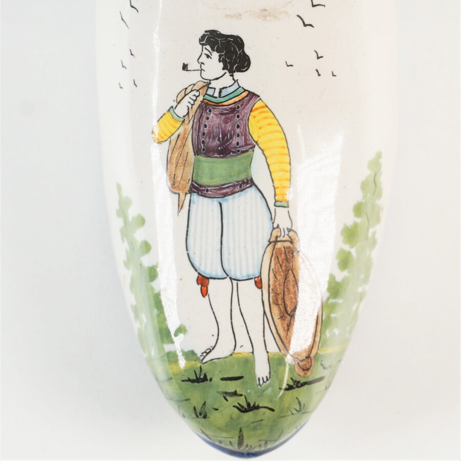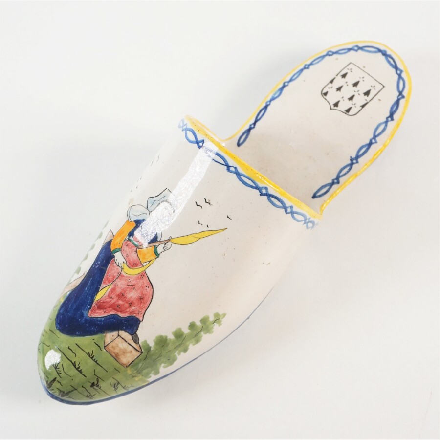 QUIMPER HB : Paire de chaussures en faïence émaillée polychrome à décor de personnages, marqués dessous, 19e siècle, L. 21 cm (petit cheveu).