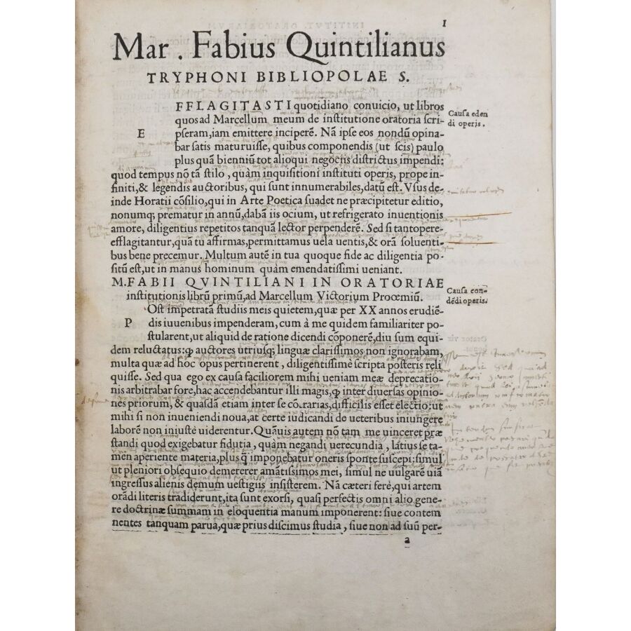 Rare édition ancienne de l'Institution oratoire du rhéteur et pédagogue latin du Ier siècle apr. J.-C. Marcus Fabius Quintilianus. Nombreuses notes marginales et sur les gardes à l'encre brune, du temps. Ex-libris postérieur de J. J. Poullin, avocat à Orléans.