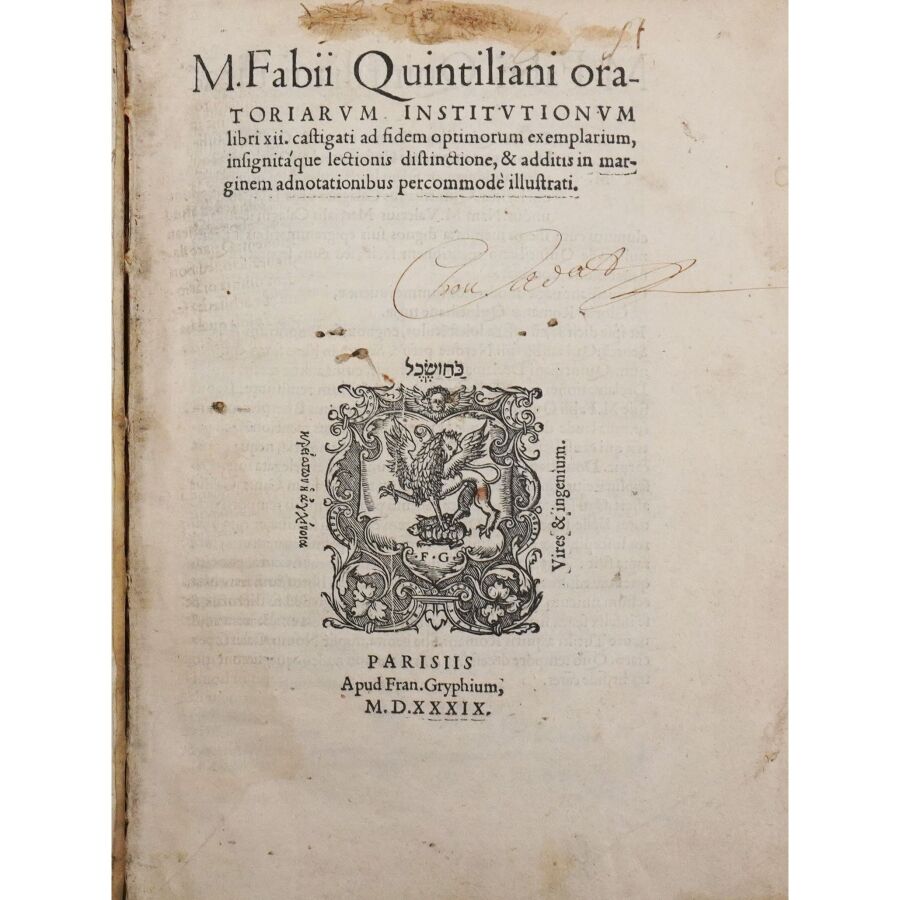 QUINTILIEN. M. Fabii Quintiliani oratorium Institutionum libri xii [...] Paris, Gryphe, 1539. In-4 de [4]-228-LXVI ff. Veau brun, dos à nerfs orné, roulettes d'encadrement à froid sur les plats (reliure de l'époque). Reliure usagée, manques de cuir au dos.