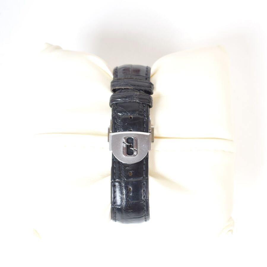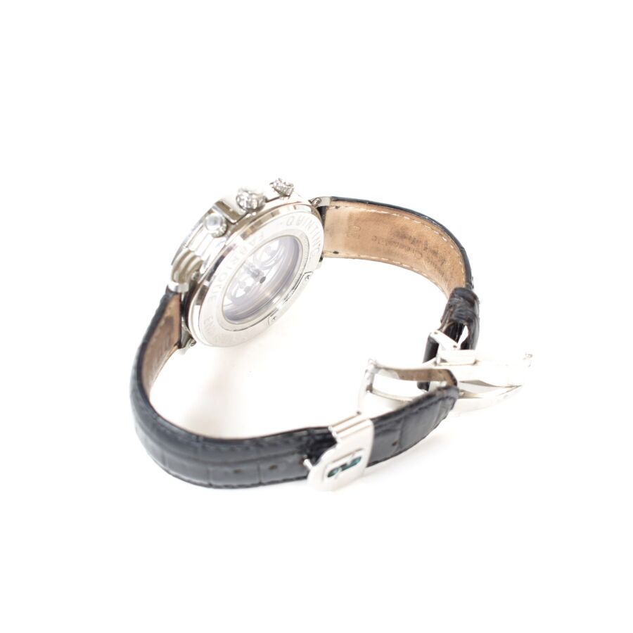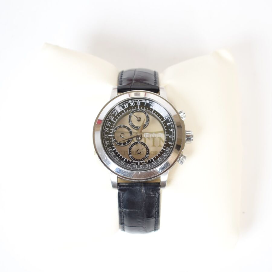 QUINTING : Montre modèle « Mysterious Chronographe QSL55 », en acier, water-résistant, cadran circulaire avec affichage à trois sous-compteurs avec index et chiffres arabes blancs sur fond noir, aiguilles en métal argenté facetté, fond à vis en acier signé et numéroté, mouvement à quartz, bracelet en cuir Quinting, présentée avec son écrin d'origine.