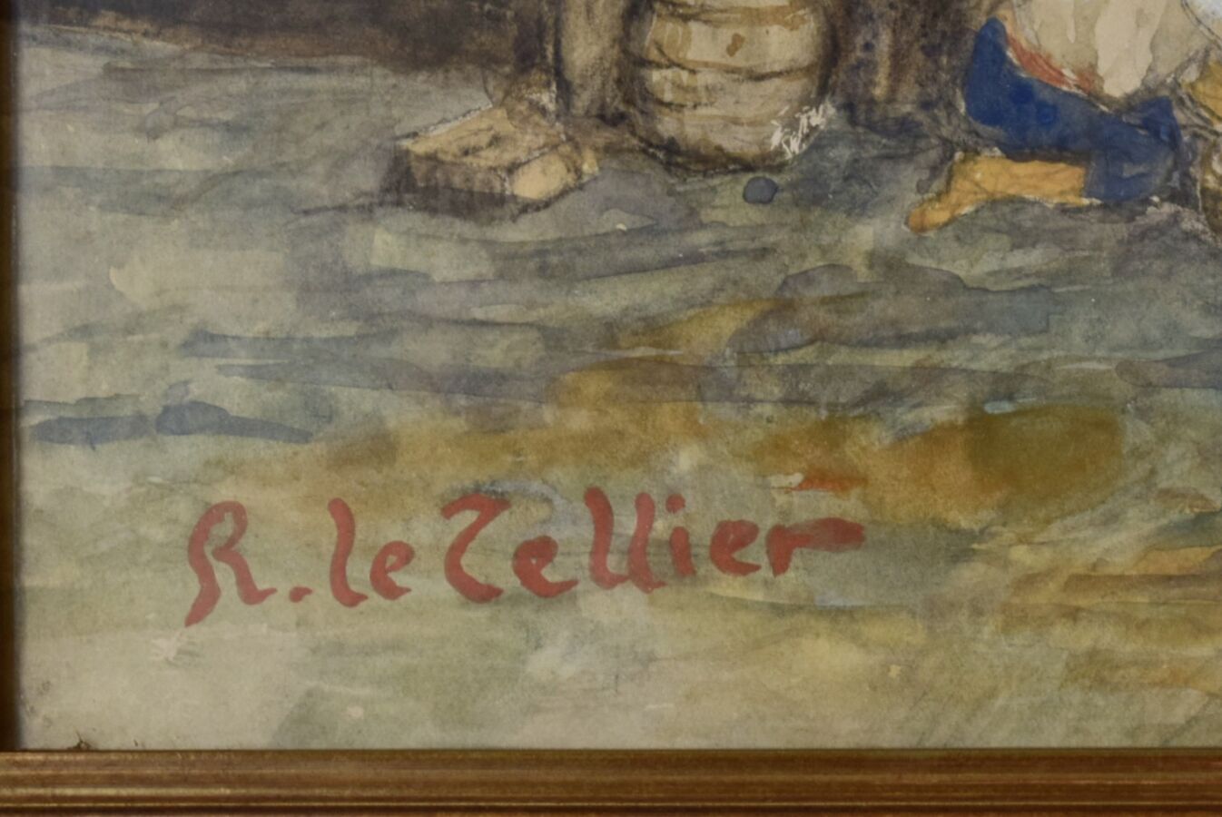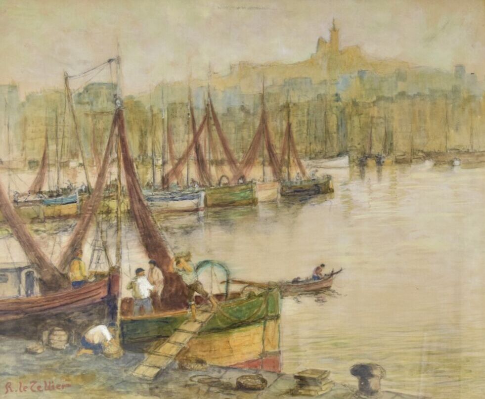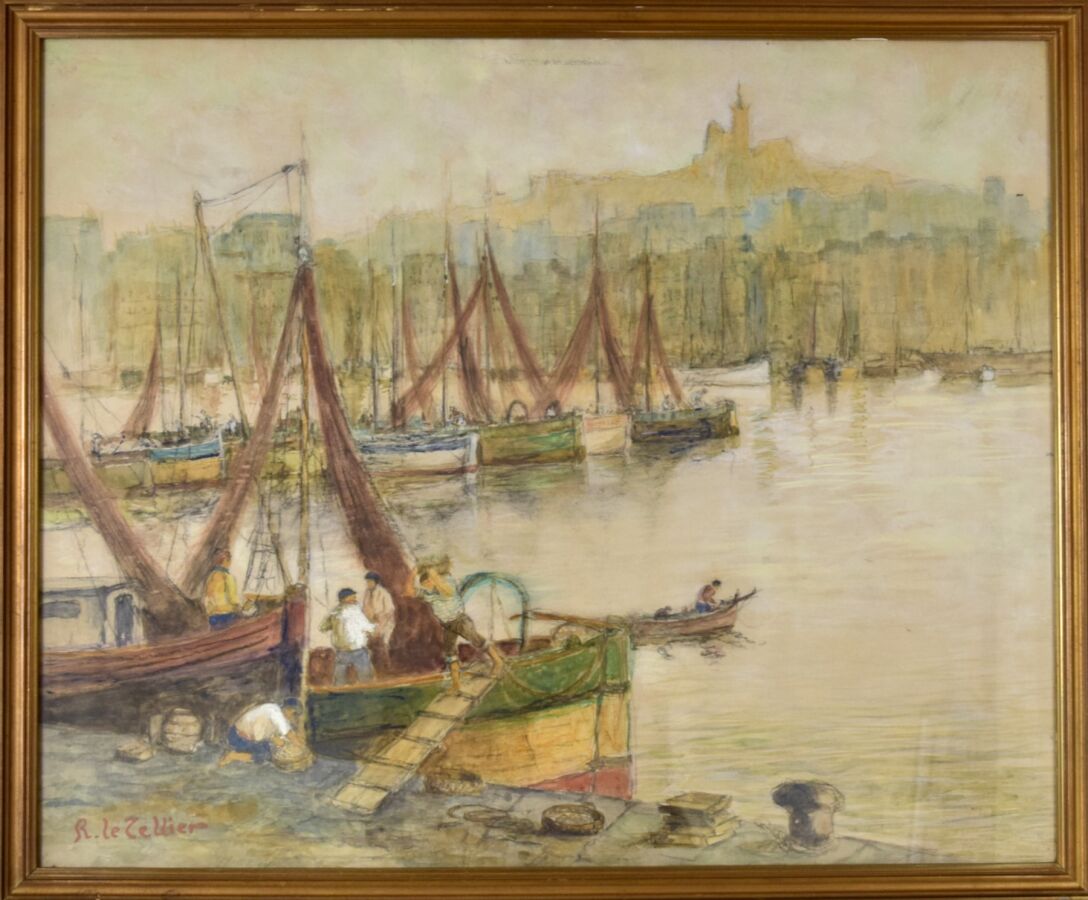 R. LE TELLIER, "Le Port de Marseille", aquarelle, signée en bas à gauche, 48 x 60 cm (à vue)
