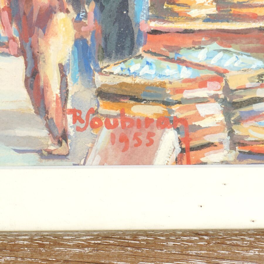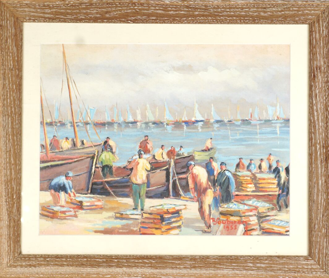 R. SAUBIRAN (XXe), "Retour de pêche" 1955, aquarelle et gouache sur papier signée et datée en bas à droite, 26 x 33,5 cm.