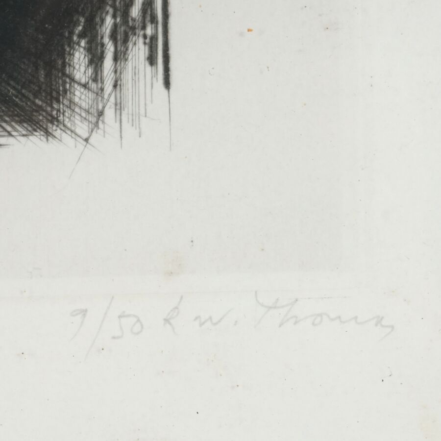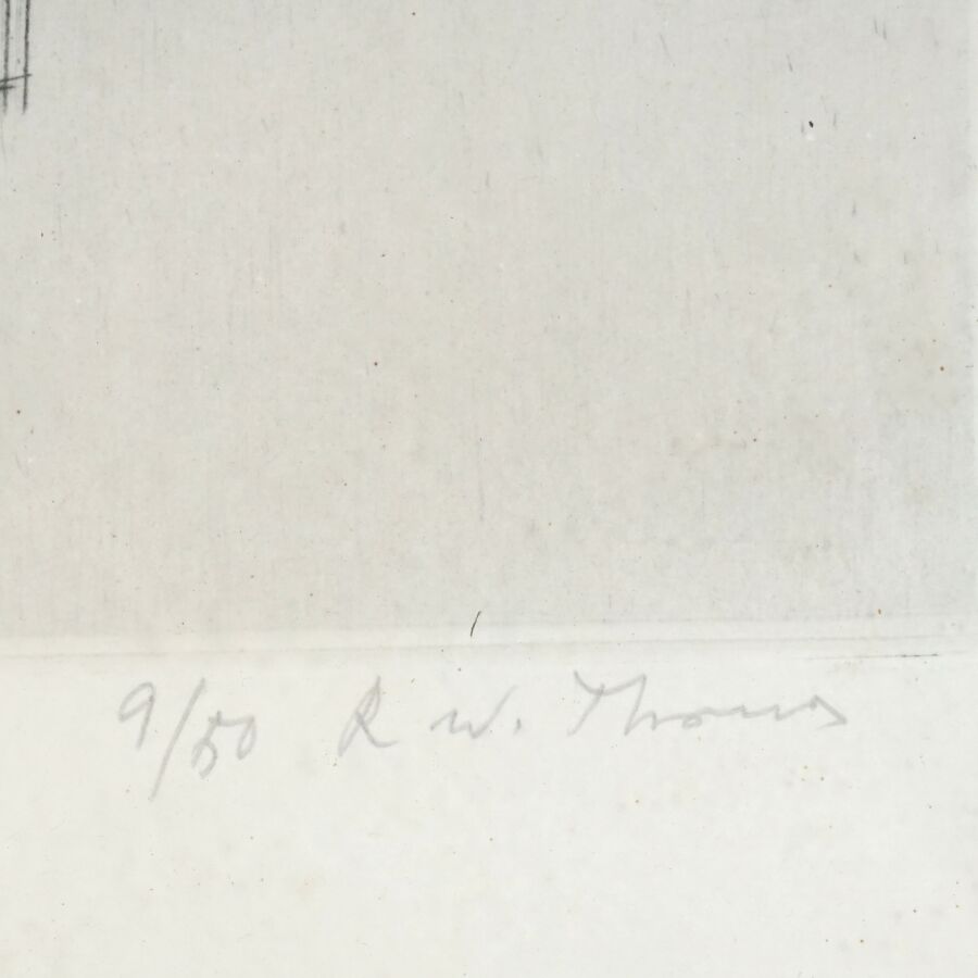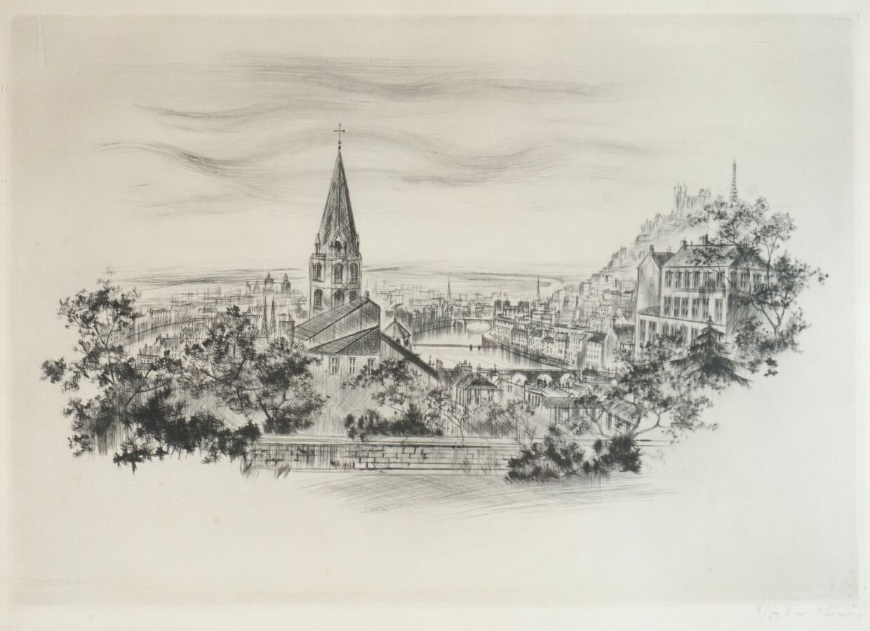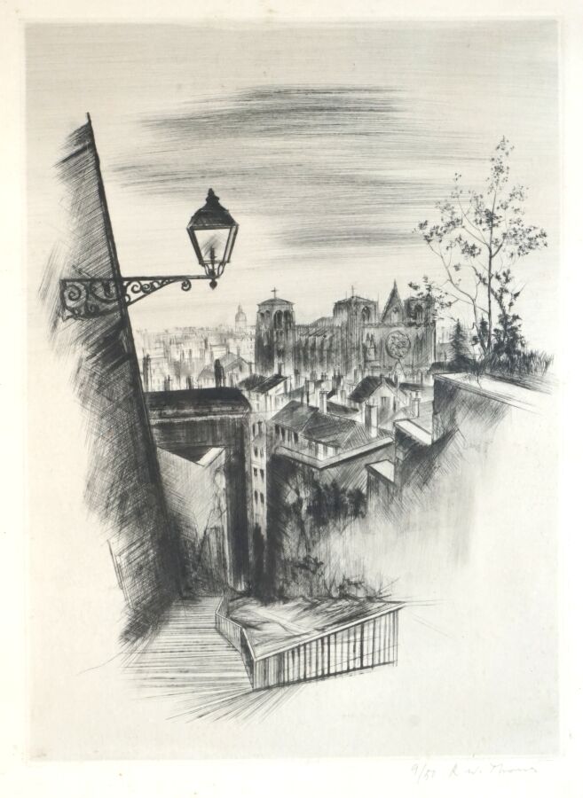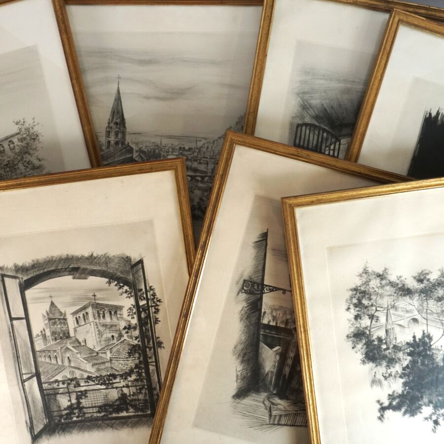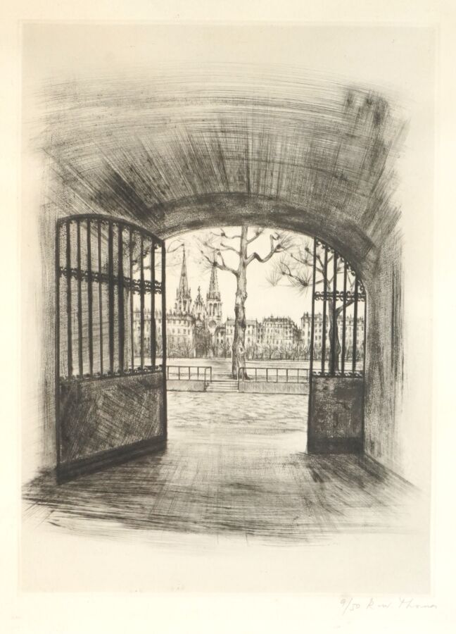 R.W. THOMAS (XXe), Sept eaux fortes représentant différents lieux de la ville de Lyon, signées et numérotées en bas à droite, 38 x 28.5 cm et une 39 x 56 cm (rousseurs).