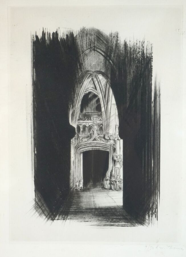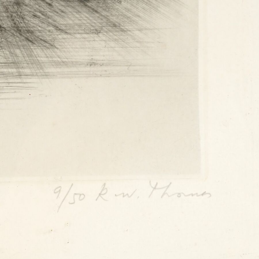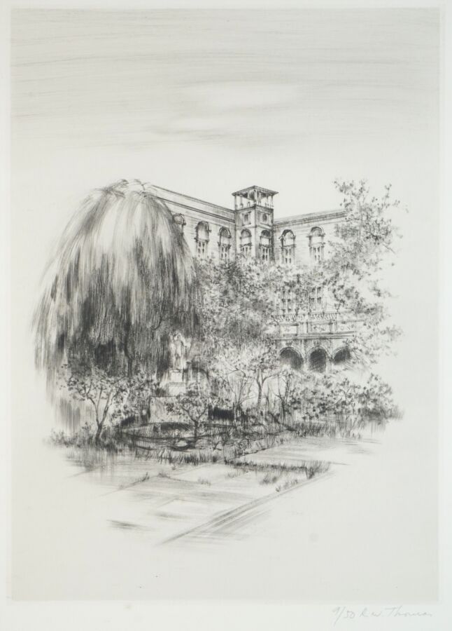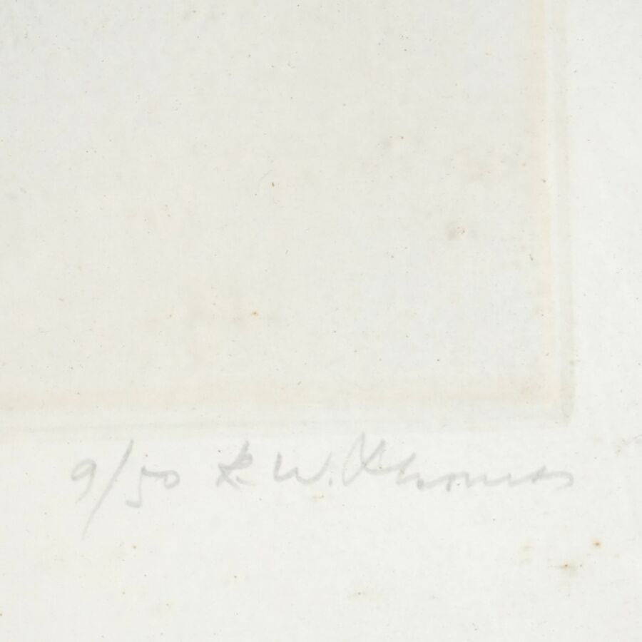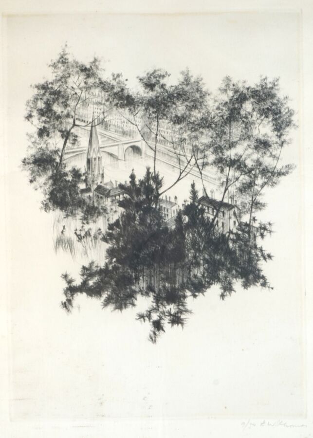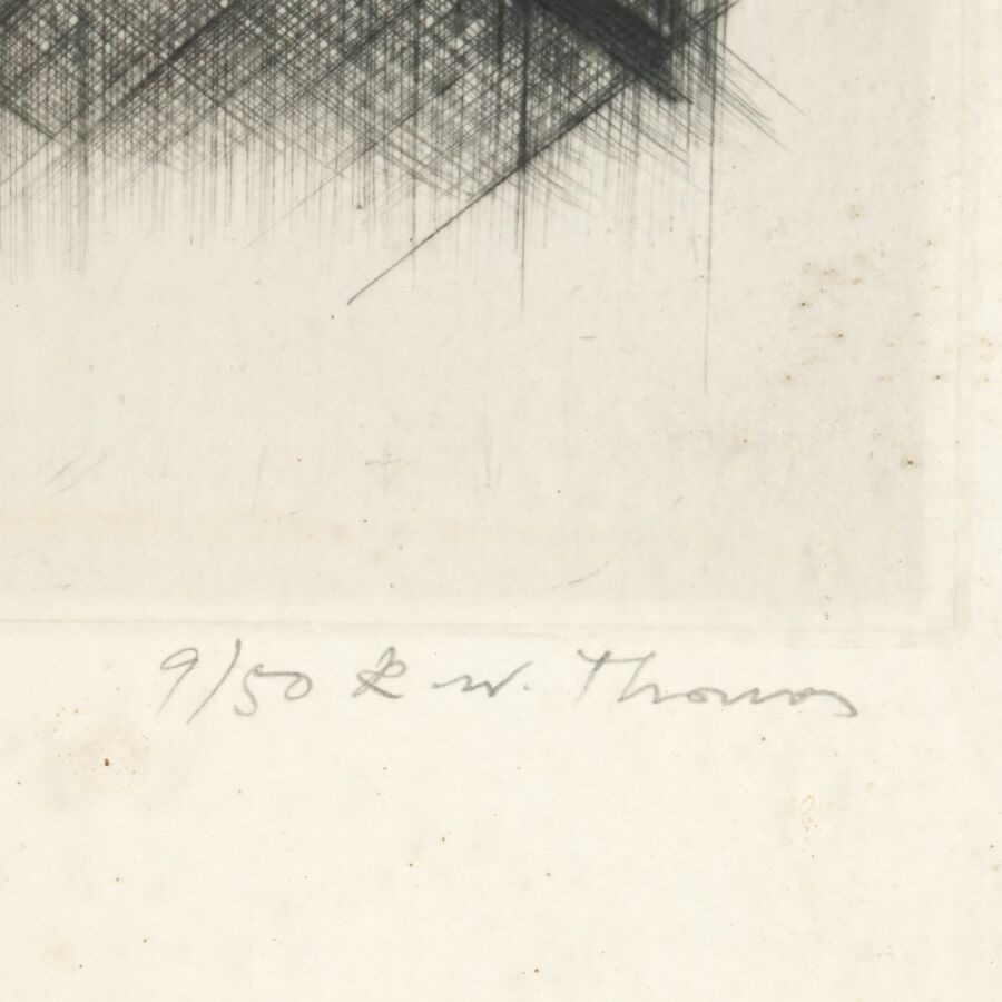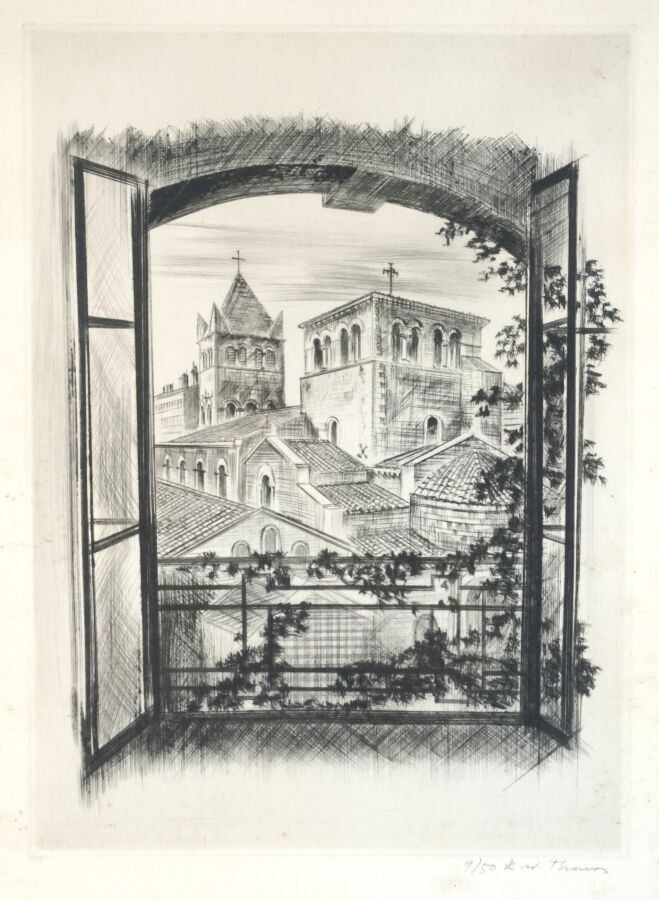 R.W. THOMAS (XXe), Sept eaux fortes représentant différents lieux de la ville de Lyon, signées et numérotées en bas à droite, 38 x 28.5 cm et une 39 x 56 cm (rousseurs).