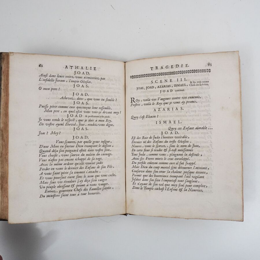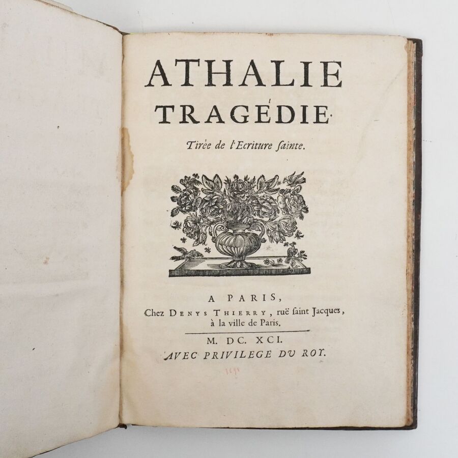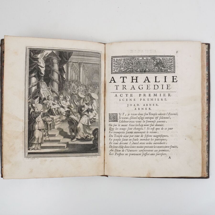 [RACINE (Jean)]. Athalie, tragédie tirée de l'Écriture sainte. Paris, Denys Thierry, 1691. In-4 de [6] ff. liminaires (titre avec verso blanc, préface, extr. de privilège, noms des personnages), [1] frontispice), 87 pp., veau brun, dos à nerfs orné, pièce de titre (reliure de l'époque).