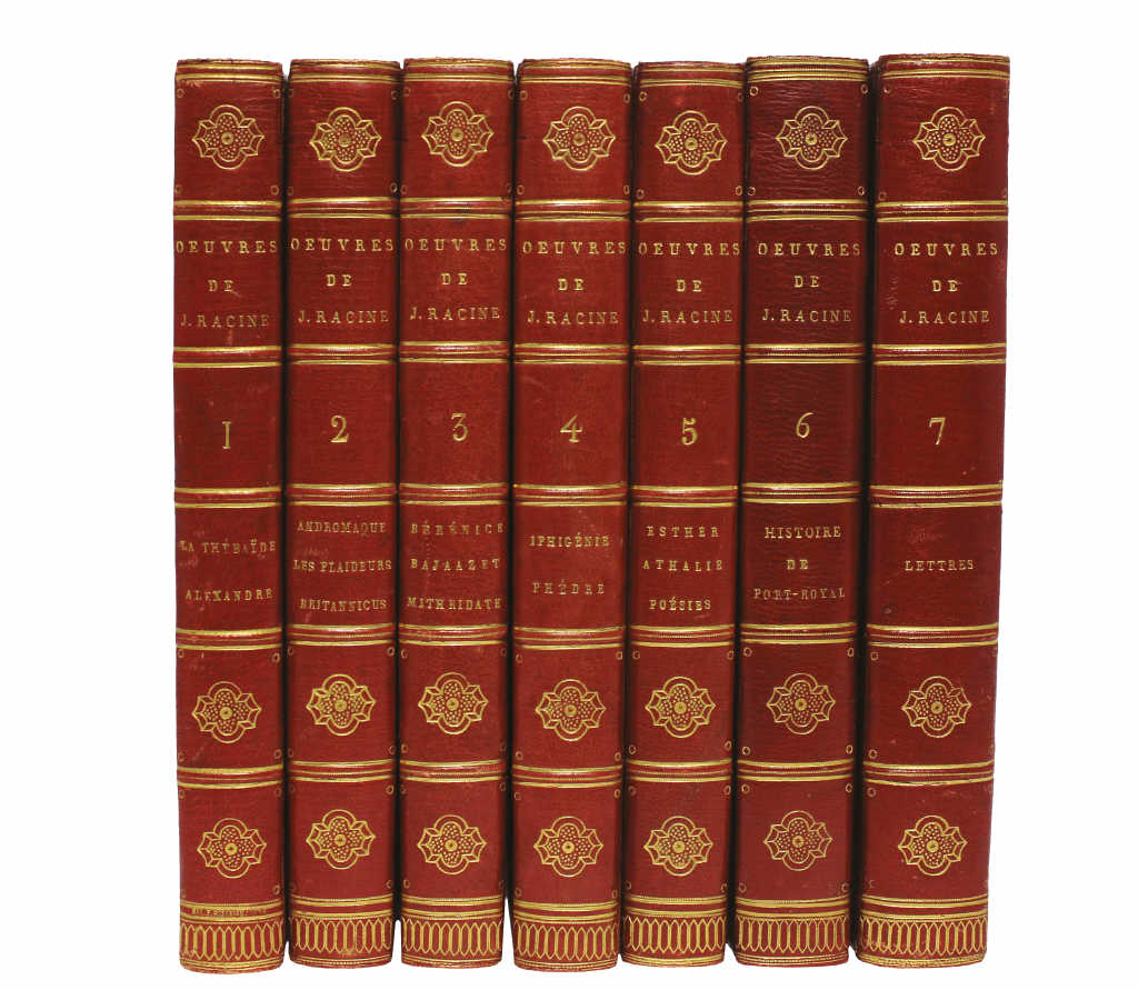 RACINE (Jean) - Oeuvres complèttes [sic] de Jean Racine avec le commentaire de M. de Laharpe, et augmentées de plusieurs morceaux inédits ou peu connus - Paris ; Chez H. Agasse, 1807 - 7 volumes In-8° - Portrait de l'auteur d'après Santerre et gravé par Piérrron en frontispice du 1er volume et 14 planches hors texte gravées en noir d'après Moreau le Jeune - 1 des 25 exemplaires sur papier vélin avec les figures avant la lettre - Reliure plein maroquin cerise à long grain (signée F. Bozerian jeune) ornée des chiffres dorés de la Duchesse de Berry et d'une dentelle dorée à chacun des plats - Gardes marbrées - Tranches dorées - De petits frottements à certains coins, 1 discret petit accroc à l'intérieur du 2nd plat du tome I - Etiquette gravée répétée à chaque volume de la bibliothèque de Rosny - Bel exemplaire. Brunet, IV 1079.