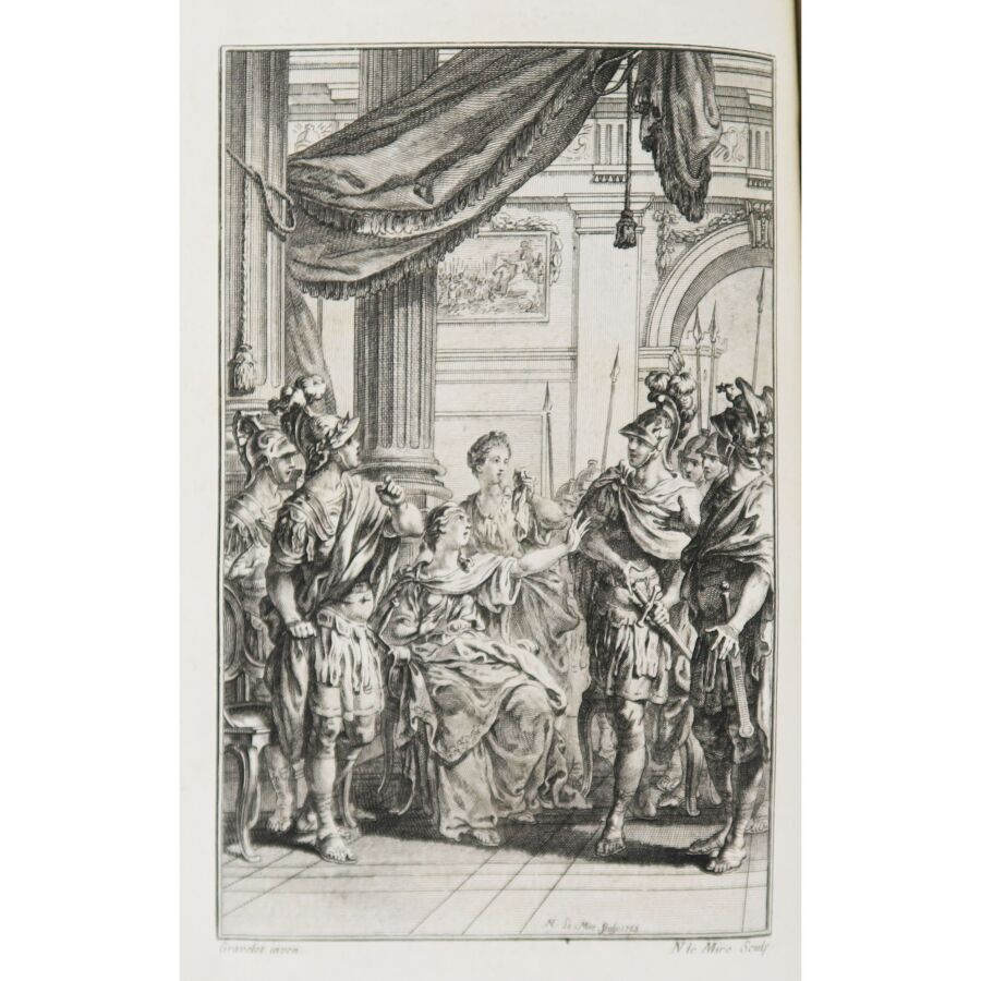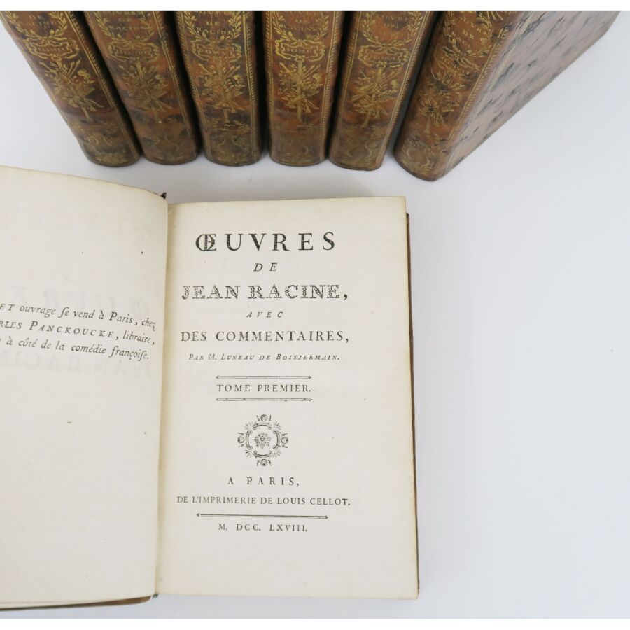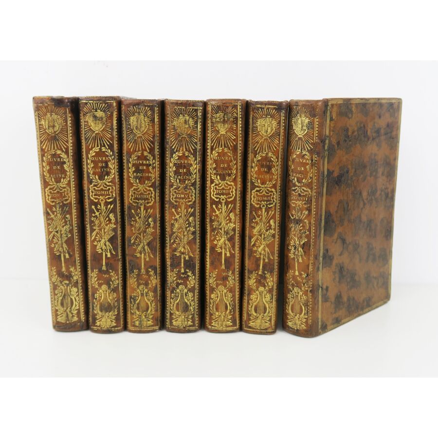 RACINE (Jean). OEuvres de Jean Racine avec des commentaires, par M. Luneau de Boisjermain. Paris, Cellot, 1768. 7 vol. in-8, veau marbré, dos lisses richement ornés, triple filet doré encadrant les plats, filet doré sur les coupes, tranches dorées. L'illustration se compose d'un portrait de l'auteur par Santerre et gravé par Gaucher ainsi que de 12 figures hors-texte par Gravelot gravées par Duclos, Flipart, Lemire, Lempereur, Levasseur, Née, Provost, Rousseau et Simonet.