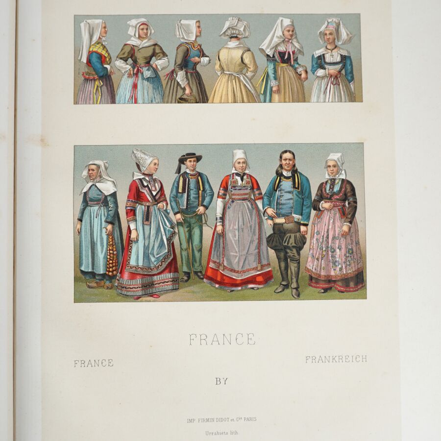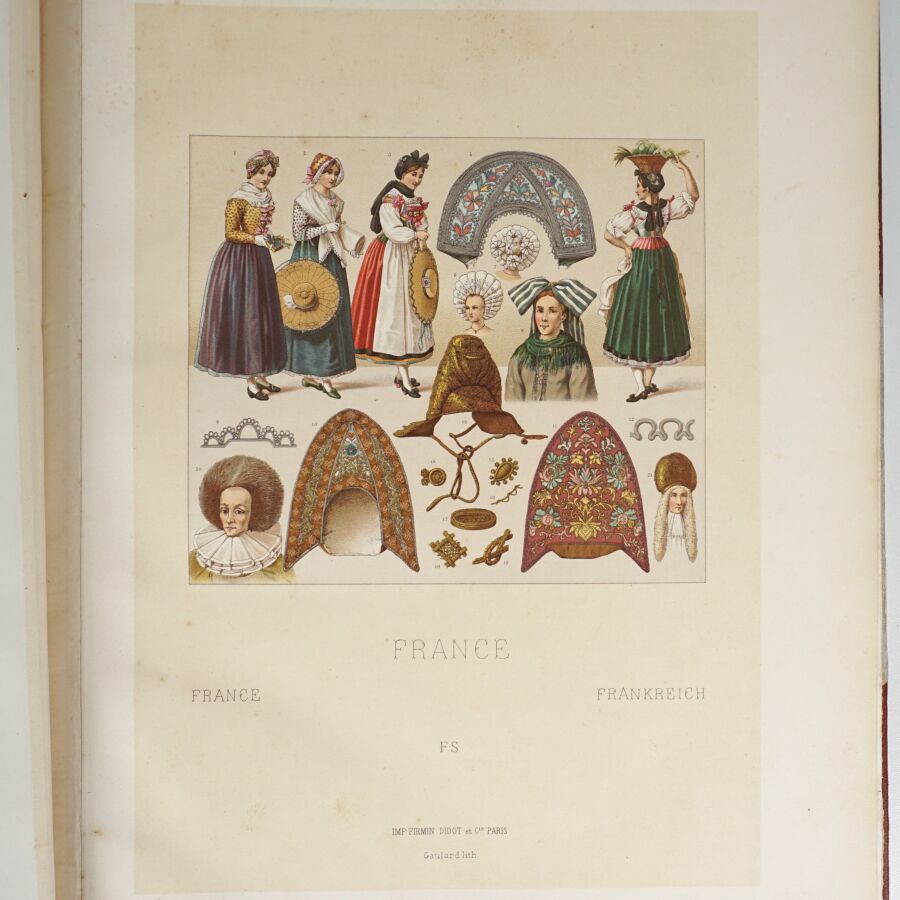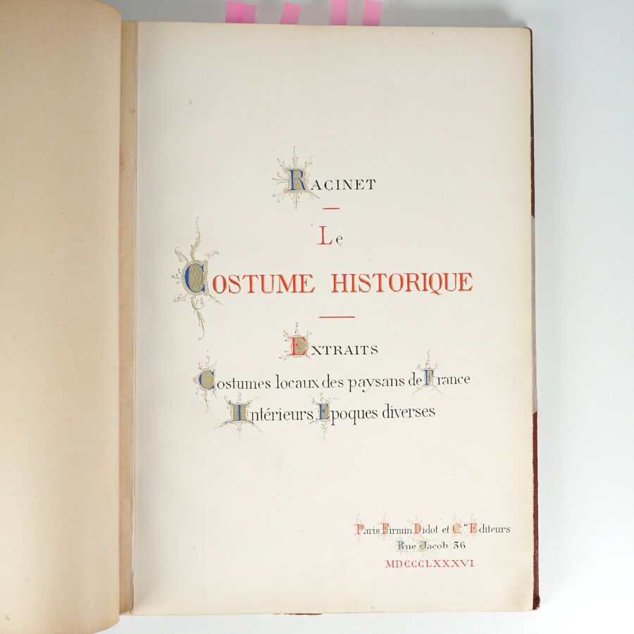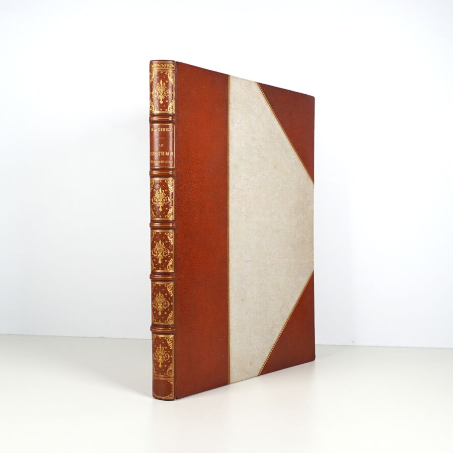 RACINET (Albert Charles Auguste). Le Costume historique. Extraits. Costumes locaux des paysans de France. Intérieurs époques diverses. Paris, Firmin Didot et Cie, 1886. In-folio de 1f. titre manuscrit soigneusement calligraphié et 37 planches (la plupart chromolithographiées) accompagnées de leurs feuillets de légende, le tout monté sur onglets. Maroquin brun à coins, dos à nerfs richement orné, titre doré, double filet doré, tête dorée.
