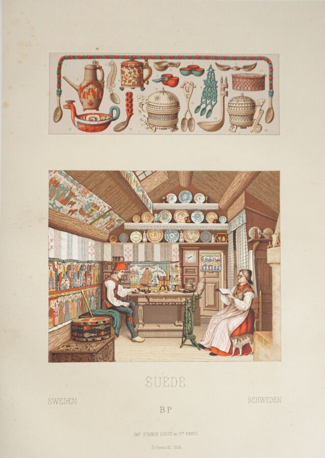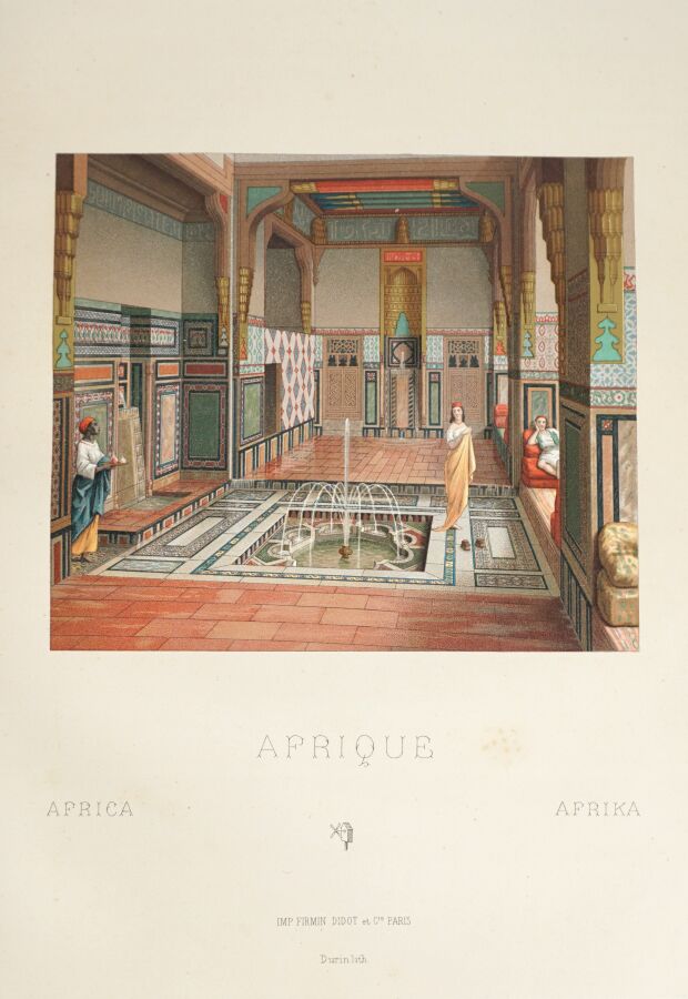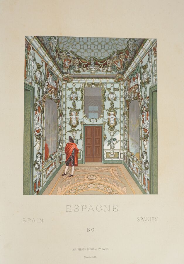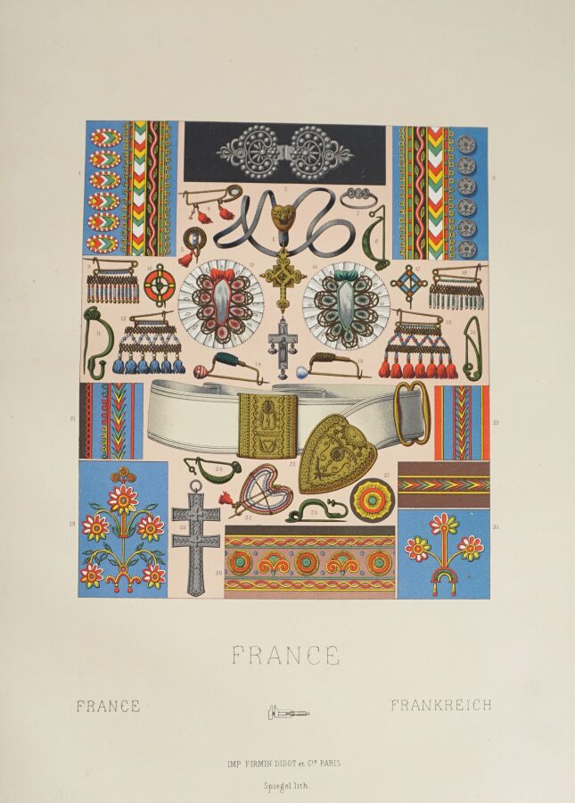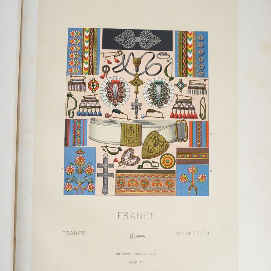 RACINET (Albert Charles Auguste). Le Costume historique. Extraits. Costumes locaux des paysans de France. Intérieurs époques diverses. Paris, Firmin Didot et Cie, 1886. In-folio de 1f. titre manuscrit soigneusement calligraphié et 37 planches (la plupart chromolithographiées) accompagnées de leurs feuillets de légende, le tout monté sur onglets. Maroquin brun à coins, dos à nerfs richement orné, titre doré, double filet doré, tête dorée.