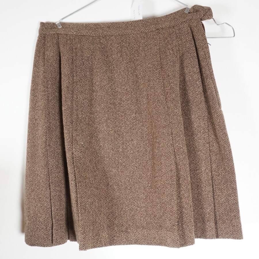 RALPH LAUREN : Ensemble tailleur-jupe marron, laine et polyester, comprenant une veste, fermeture à huit boutonnages, deux poches latérales, ourlet aux manches, taille 8 (correspond à un 40) et sa jupe type patineuse, fermeture éclair latérale et bouton, taille 6 (38/40), L. 45 cm (bel état général).
