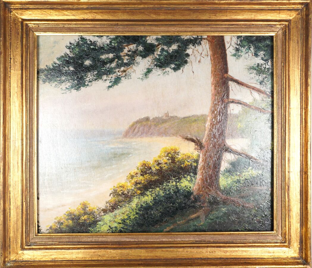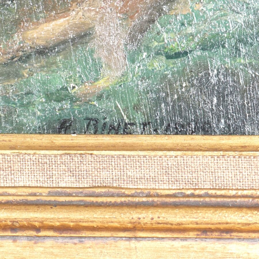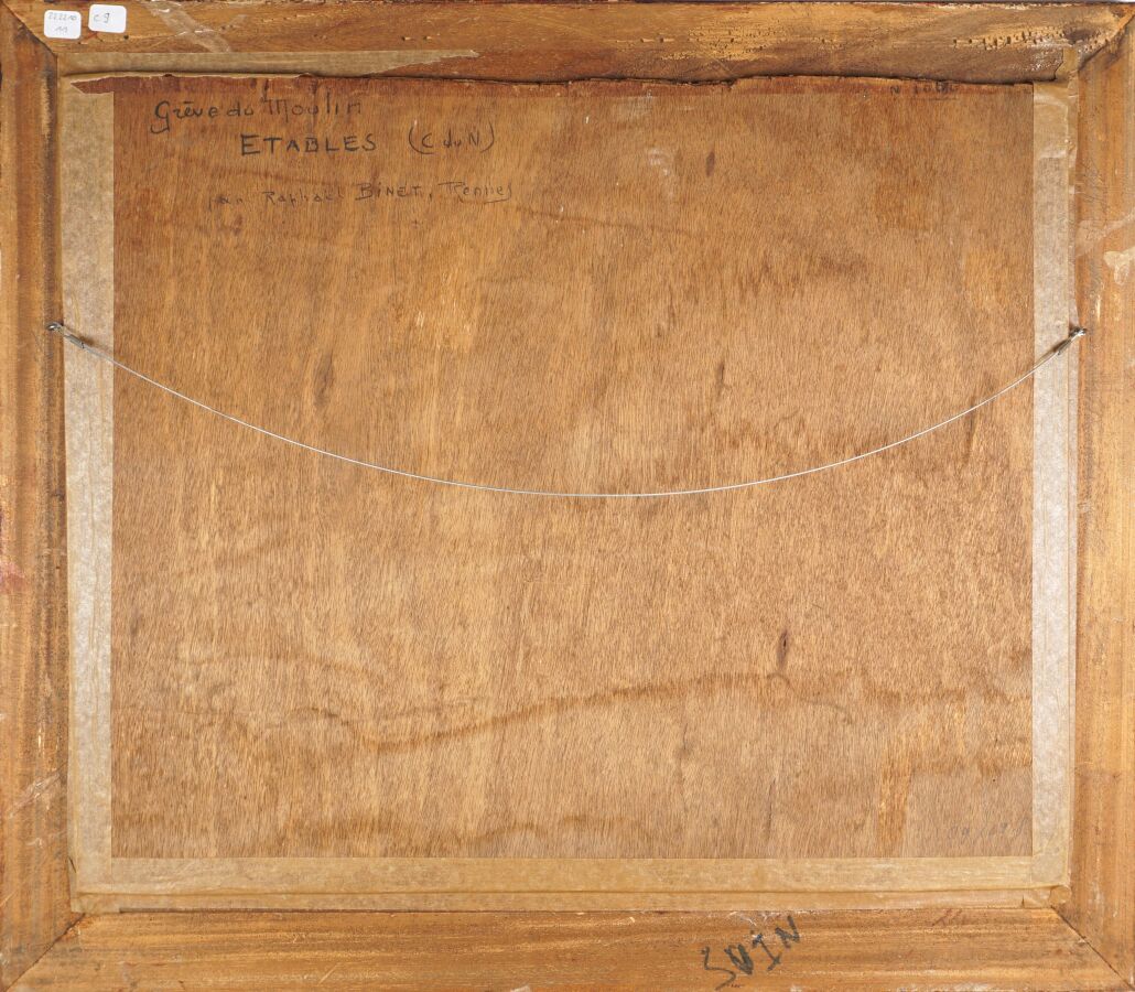 Raphaël BINET (XXe), "Grève des moulins à Étables", huile sur panneau, signée et titrée au dos, 45 x 54 cm.