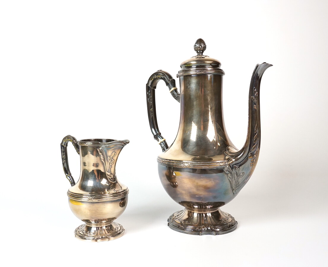 RAVINET DENFER : Cafetière et pot à lait en métal argenté à décor de joncs rubanés, les piétement piédouche à bords mouvementés ornés de cartouches feuillagés, le fretel de la cafetière formant un gland, H. 26 et 12.5 cm.