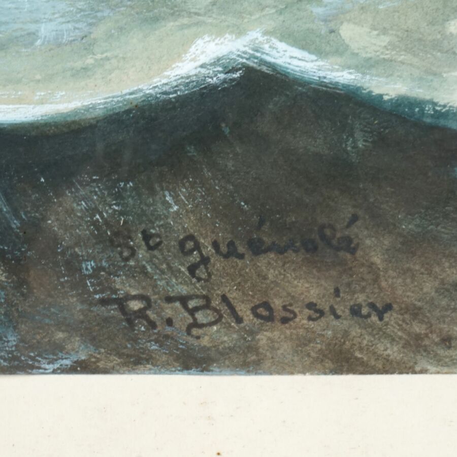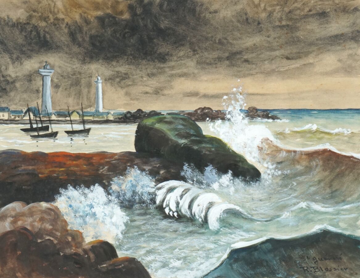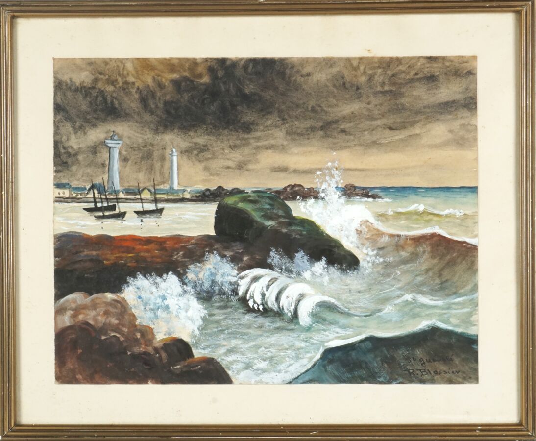 Raymond BLOSSIER (1925-2013), "St-Guénolé, les phares", gouache sur papier, signée et située en bas à droite, 25 x 32.5 cm (à vue).