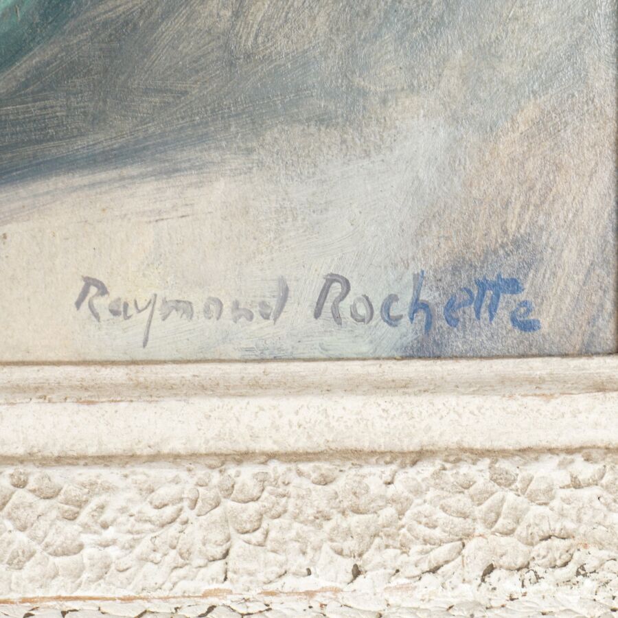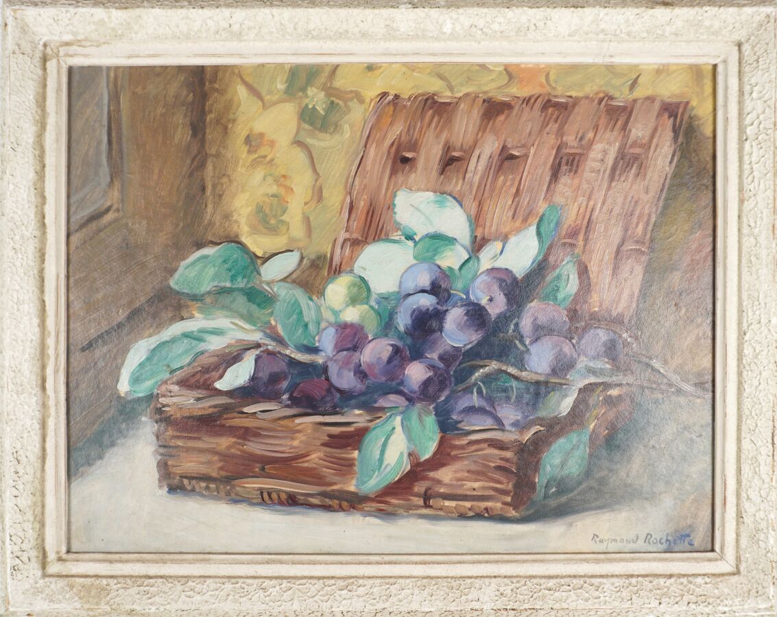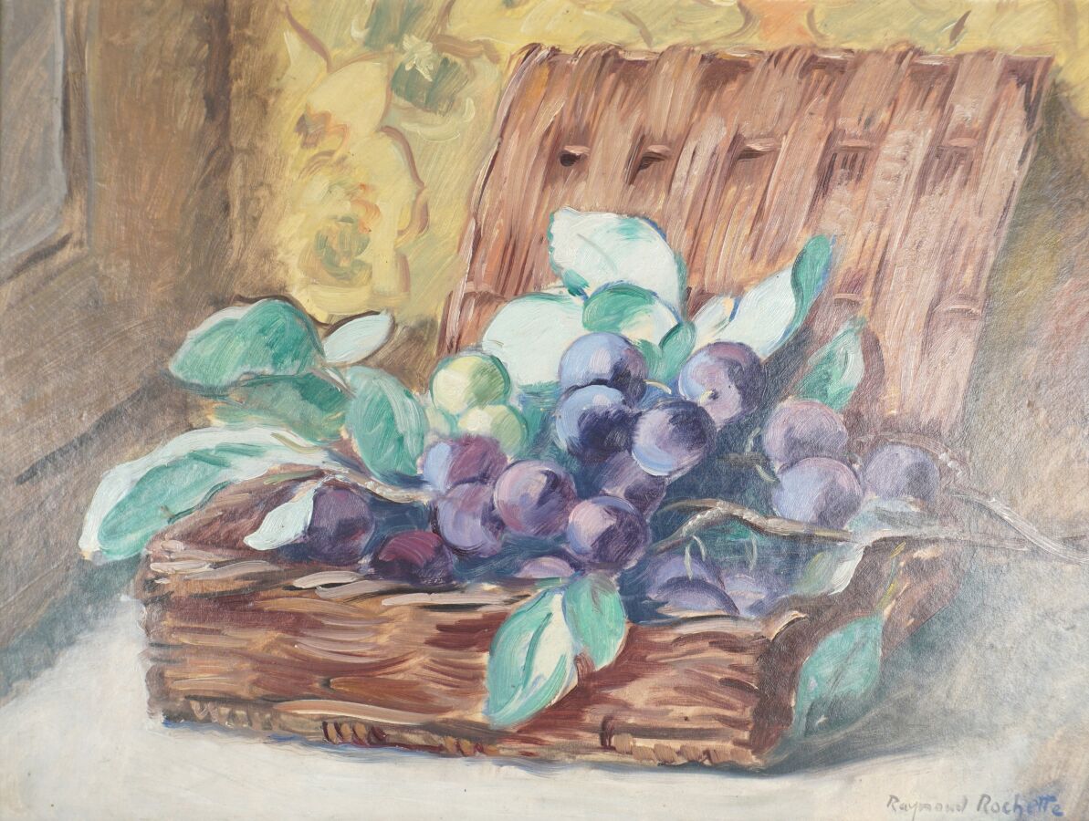 Raymond ROCHETTE (1906-1993), "Nature morte aux prunes", huile sur papier marouflée sur carton, signée en bas à droite, 34.5 x 45.7 cm.