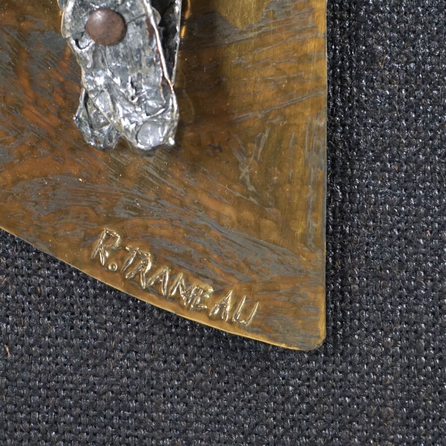 Raymond TRAMEAU (1897-1985), "Christ", sculpture en bronze à patine argenté, sur feuille de métal doré, signée en creux sur le bas de la feuille, présentée sur panneau en bois, H. 65 cm L. 35 cm (Dim. Totales : 80 x 50 cm).
