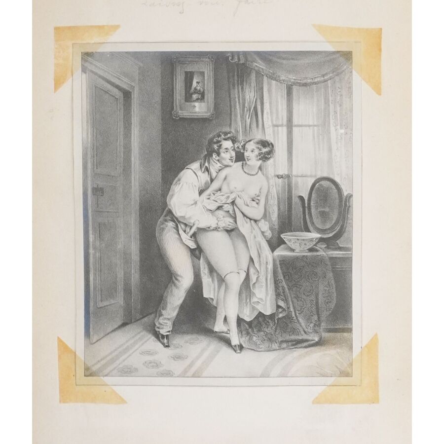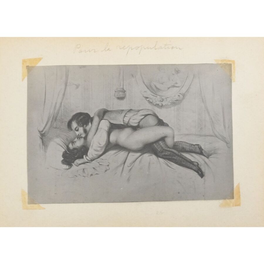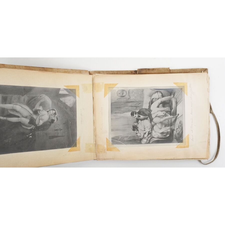 Recueil. Carnet in-8 oblong cartonnage toile beige à lacet, renfermant 78 tirages photographiques reproduisant des gravures et scènes érotiques diverses.