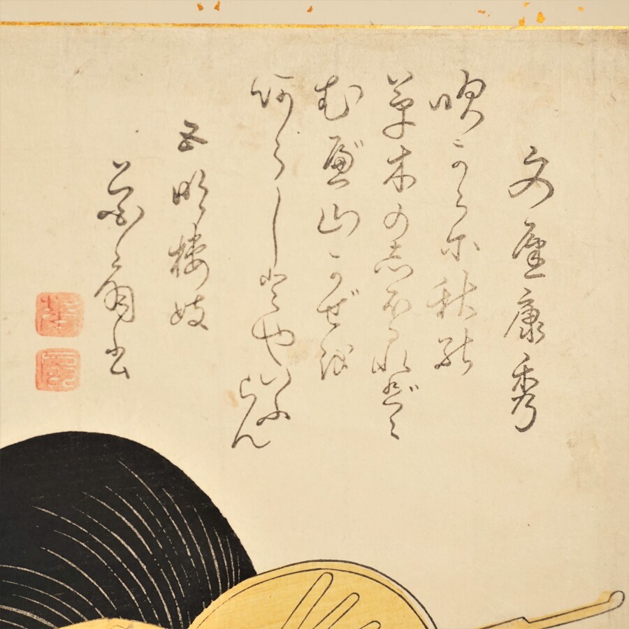 Recueil de dix estampes oban tate-e, intitulé "Choix de vieilles estampes japonaises de l'école ite Ukiyo-e", comprenant : D'après Utamarô, quatre estampes, dont : une série de courtisanes comparées à des fleurs, pivoines, Hanaôgi d'Ogiya, à Edo ; mère et son fils ; couple ; trois femmes. D'après Bunrô, couple avec deux faucons ; D'après Kikumaro, de la série, "Selection de fleurs populaires, Karakoto de la maison de thé Chôji-ya ; D'après ToyokuniI, deux estampes : marchande de rue ; femmes et enfants. D'après Shunshô, jeunes femmes dans un parc. Anonyme, partie de triptyque, trois courtisanes. Japon, période Meji (1868-1912) (Marouflées sur carton et réunies en album; usures, tâches) Nb. Ce recueil a sans doute été constitué à l'époque Meiji, suite au grand engouement pour les estampes japonaises en Europe, suscitant une forte demande, et de nombreux retirages d'artistes célèbres.